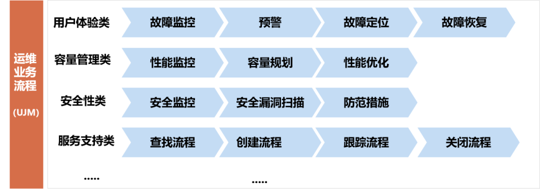 OSM与UJM模型结合,就是将UJM模型中用户体验作为重要参考指标。通过科技运营指标监测,了解系统和服务的稳定性、性能和安全性,从而更好的支持和提升用户体验。按照用户体验、容量管理、安全性、服务支持等思路梳理流程如下。