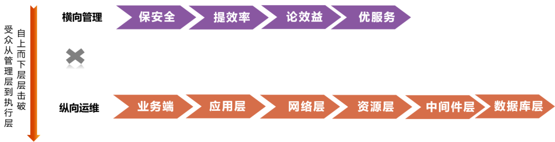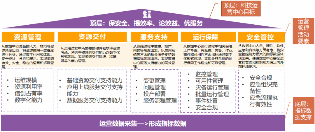 基于横向管理指标体系框架横向运营管理体系中,顶层围绕保安全、提效率、论效益、优服务的服务器租用工作目标,在策略层面从资源管理、资源交付、服务支持、运行保障、安全管控五个运营管理活动要素上进行拆解到具体指标。