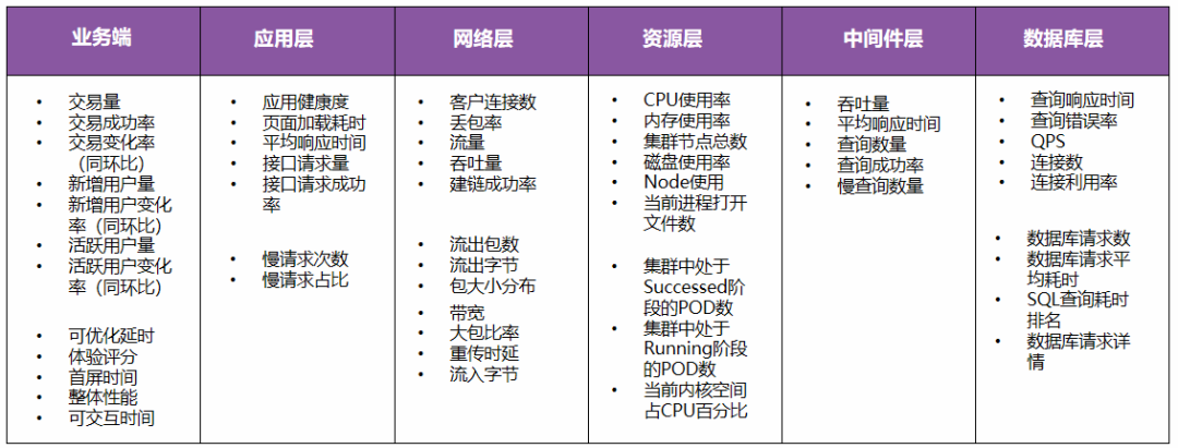 基于纵向运维指标体系框架纵向运维管理以应用为核心,从业务端出发,按照IT系统自上而下调用依赖关系,分为五层技术指标:应用层、网络层、资源层、中间件层、数据库层。最终构建了一套具备总览应用系统健康度,形成立体化分析的指标体系。 如某重要渠道系统日交易量近期高于峰值,且CPU、内存等利用率偏高,就要及时跟进业务运营状态,并考虑资源扩容等问题。
