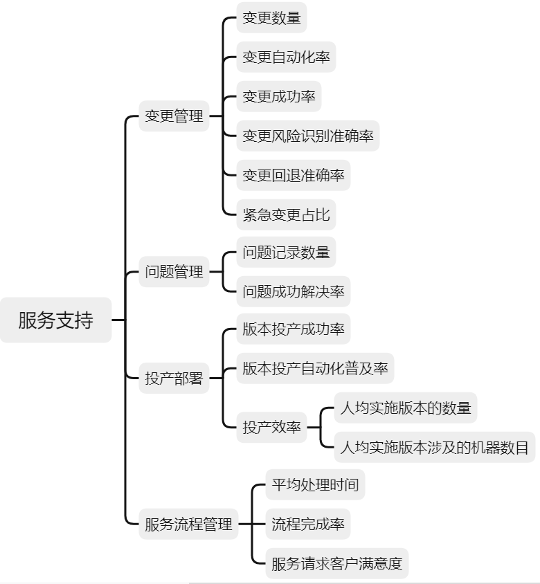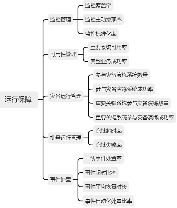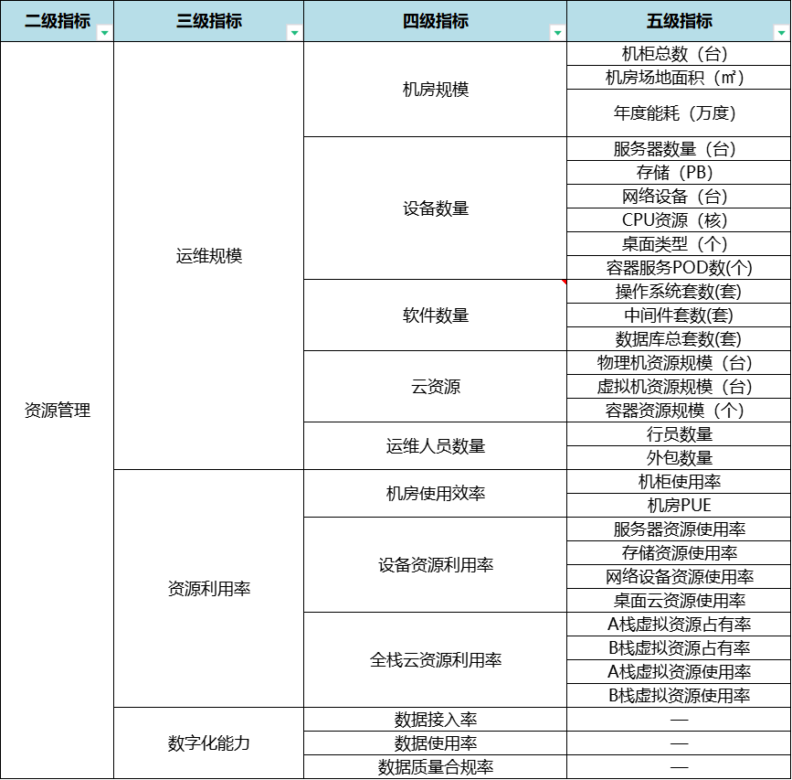 指标体系应用实践 下面介绍G行科技运营横向管理的指标体系建设实践。 资源管理在资源管理方面,通过对资源精细化控制,提升资源管理效率。主要从数据中心运维规模、资源利用率、数字化能力等方面入手。运维规模指标主要要包括机房规模、设备数量、软件数量、香港云服务器云资源、运维人员数量等;资源利用率指标包括机房使用效率、设备资源利用率、云资源利用率;数字化能力指标是指以数据要素作为数字经济时代的核心资产,通过接入、使用、质量合规等方面对运维数据资产持续运营管理。   资源交付在资源交付方面,从运维过程中所需要的硬件和软件资源考量,将这些资源的交付能力以数字化形式体现,实现资源交付快速、准确、可靠的能力管理。   服务支持在服务支持方面,从运维过程中变更、投产、问题等角度出发,通过数字化指标反映应用系统相关服务支持情况,实现数据中心服务支持能力的高效管理。   运行保障在运行保障方面,从科技运营过程中相关保障工作考虑,将监控、灾备、批量运行、事件和可用性方面指标通过数字化形式体现,实现业务系统的运行保障工作稳定和可靠管理。   安全管控在安全管控方面,从科技运营安全合规、应急等方面考虑,将安全管控能力相关的指标数据体现出来,使得数据中心安全运营的管理和控制能力满足内外部环境要求。