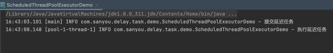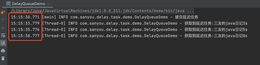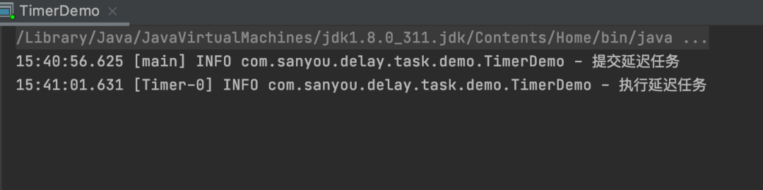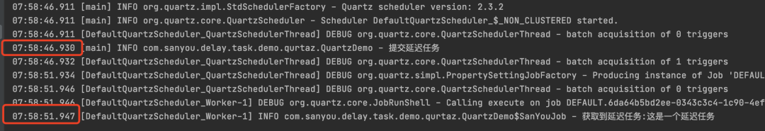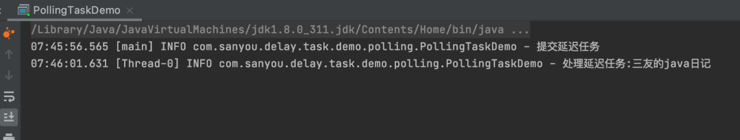 启动的时候会开启一个QuartzSchedulerThread调度线程,这个线程会去判断任务是否到了执行时间,到的话就将任务交给任务线程池去执行。 无限轮询延迟任务无限轮询的意思就是开启一个线程不停的去轮询任务,当这些任务到达了延迟时间,那么就执行任务。 demo 复制@Slf4j public class PollingTaskDemo { private static final List<DelayTask> DELAY_TASK_LIST = new CopyOnWriteArrayList<>(); public static void main(String[] args) { new Thread(() -> { while (true) { try { for (DelayTask delayTask : DELAY_TASK_LIST) { if (delayTask.triggerTime <= System.currentTimeMillis()) { log.info("处理延迟任务:{}", delayTask.taskContent); DELAY_TASK_LIST.remove(delayTask);} } TimeUnit.MILLISECONDS.sleep(100); } catch (Exception e) { } } }).start(); log.info("提交延迟任务"); DELAY_TASK_LIST.add(new DelayTask("三友的java日记", 5L)); } @Getter @Setter public static class DelayTask { private final String taskContent; private final Long triggerTime; public DelayTask(String taskContent, Long delayTime) { this.taskContent = taskContent; this.triggerTime = System.currentTimeMillis() + delayTime * 1000; } } }1.2.3.4.5.6.7.8.9.10.11.12.13.14.15.16.17.18.19.20.21.22.23.24.25.26.27.28.29.30.31.32.33.34.35.36.37.38.39.40. 任务可以存在数据库又或者是内存,看具体的需求,这里我为了简单就放在内存里了。 执行结果: 图片