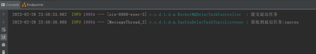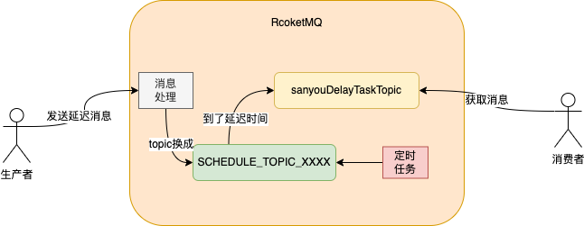 当发送消息的时候只需要指定延迟等级即可。如果这18个等级的延迟时间不符和你的要求,可以修改RocketMQ服务端的配置文件。 来个demo依赖 复制<dependency> <groupId>org.apache.rocketmq</groupId> <artifactId>rocketmq-spring-boot-starter</artifactId> <version>2.2.1</version> <!--web依赖--> <dependency> <groupId>org.springframework.boot</groupId> <artifactId>spring-boot-starter-web</artifactId> <version>2.2.5.RELEASE</version> </dependency>1.2.3.4.5.6.7.8.9.10.11. 配置文件 复制rocketmq: name-server: 192.168.200.144:9876 #服务器ip:nameServer端口 producer: group: sanyouProducer1.2.3.4. controller类,通过DefaultMQProducer发送延迟消息到sanyouDelayTaskTopic这个topic,延迟等级为2,也就是延迟时间为5s的意思。 复制@RestController @Slf4j public class RocketMQDelayTaskController { @Resource private DefaultMQProducer producer; @GetMapping("/rocketmq/add") public void addTask(@RequestParam("task") String task) throws Exception { Message msg = new Message("sanyouDelayTaskTopic", "TagA", task.getBytes(RemotingHelper.DEFAULT_CHARSET)); msg.setDelayTimeLevel(2); // 发送消息并得到消息的发送结果,然后打印 log.info("提交延迟任务"); producer.send(msg); } }1.2.3.4.5.6.7.8.9.10.11.12.13.14.15.16.17. 创建一个消费者,监听sanyouDelayTaskTopic的消息。 复制@Component @RocketMQMessageListener(consumerGroup = "sanyouConsumer", topic = "sanyouDelayTaskTopic") @Slf4j public class SanYouDelayTaskTopicListener implements RocketMQListener<String> { @Override public void onMessage(String msg) { log.info("获取到延迟任务:{}", msg);} }1.2.3.4.5.6.7.8.9.10.11. 启动应用,浏览器输入以下链接添加任务 http://localhost:8080/rocketmq/add?task=sanyou测试结果: 图片 实现原理 图片