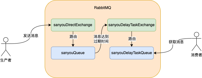 定时任务 RocketMQ这种实现方式相比于前面提到的三种更加可靠,因为前面提到的三种任务内容都是存在内存的,服务器重启任务就丢了,如果要实现任务不丢还得自己实现逻辑,但是RocketMQ消息有持久化机制,能够保证任务不丢失。 RabbitMQRabbitMQ也是一款消息中间件,通过RabbitMQ的死信队列也可以是先延迟任务的功能。 demo引入RabbitMQ的依赖 复制<dependency> <groupId>org.springframework.boot</groupId> <artifactId>spring-boot-starter-amqp</artifactId> <version>2.2.5.RELEASE</version> </dependency>1.2.3.4.5. 配置文件 复制spring: rabbitmq: host: 192.168.200.144 #服务器ip port: 5672 virtual-host: /1.2.3.4.5. RabbitMQ死信队列的配置类,后面说原理的时候会介绍干啥的。 复制@Configuration public class RabbitMQConfiguration { @Bean public DirectExchange sanyouDirectExchangee() { return new DirectExchange("sanyouDirectExchangee"); } @Bean public Queue sanyouQueue() { return QueueBuilder //指定队列名称,并持久化 .durable("sanyouQueue") //设置队列的超时时间为5秒,也就是延迟任务的时间 .ttl(5000) //指定死信交换机 .deadLetterExchange("sanyouDelayTaskExchangee") .build(); } @Bean public Binding sanyouQueueBinding() { return BindingBuilder.bind(sanyouQueue()).to(sanyouDirectExchangee()).with(""); } @Bean public DirectExchange sanyouDelayTaskExchange() { return new DirectExchange("sanyouDelayTaskExchangee"); } @Bean public Queue sanyouDelayTaskQueue() { return QueueBuilder //指定队列名称,并持久化 .durable("sanyouDelayTaskQueue") .build(); } @Bean public Binding sanyouDelayTaskQueueBinding() { return BindingBuilder.bind(sanyouDelayTaskQueue()).to(sanyouDelayTaskExchange()).with(""); } }1.2.3.4.5.6.7.8.9.10.11.12.13.14.15.16.17.18.19.20.21.22.23.24.25.26.27.28.29.30.31.32.33.34.35.36.37.38.39.40.41.42.43.44. RabbitMQDelayTaskController用来发送消息,这里没指定延迟时间,是因为在声明队列的时候指定了延迟时间为5s 复制@RestController @Slf4j public class RabbitMQDelayTaskController { @Resource private RabbitTemplate rabbitTemplate; @GetMapping("/rabbitmq/add") public void addTask(@RequestParam("task") String task) throws Exception { // 消息ID,需要封装到CorrelationData中 CorrelationData correlationData = new CorrelationData(UUID.randomUUID().toString()); log.info("提交延迟任务"); // 发送消息 rabbitTemplate.convertAndSend("sanyouDirectExchangee", "", task, correlationData); } }1.2.3.4.5.6.7.8.9.10.11.12.13.14.15.16.17. 启动应用,浏览器输入以下链接添加任务。 http://localhost:8080/rabbitmq/add?task=sanyou测试结果,成功实现5s的延迟任务。 实现原理 图片