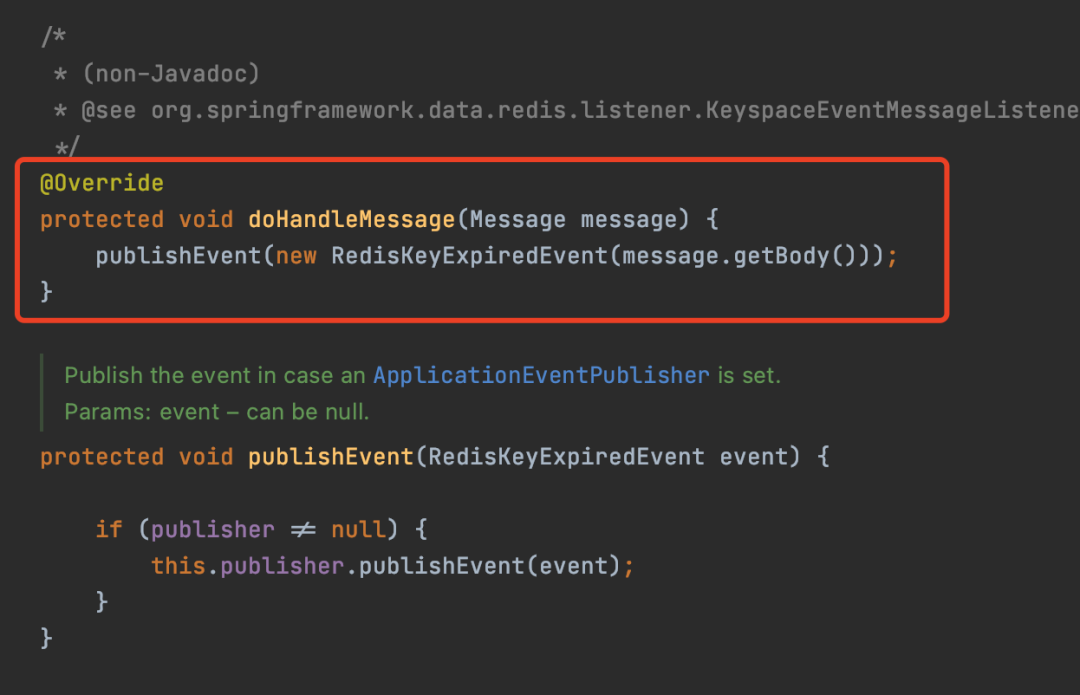 当KeyExpirationEventMessageListener收到Redis发布的过期Key的消息的时候,会发布RedisKeyExpiredEvent事件。 图片
