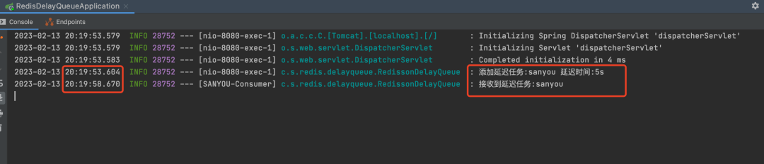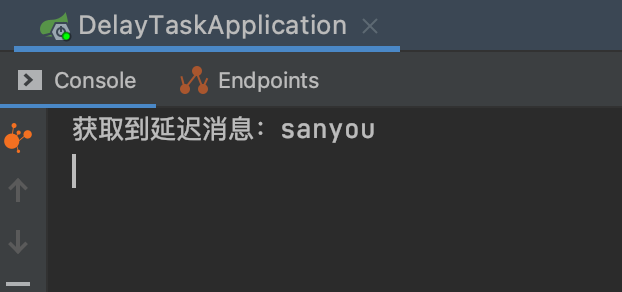 所以我们只需要监听RedisKeyExpiredEvent事件就可以拿到过期消息的Key,也就是延迟消息。 对RedisKeyExpiredEvent事件的监听实现MyRedisKeyExpiredEventListener 复制@Component public class MyRedisKeyExpiredEventListener implements ApplicationListener<RedisKeyExpiredEvent> { @Override public void onApplicationEvent(RedisKeyExpiredEvent event) { byte[] body = event.getSource(); System.out.println("获取到延迟消息:" + new String(body)); } }1.2.3.4.5.6.7.8.9.10. 代码写好,启动应用。 之后我直接通过Redis命令设置消息,就没通过代码发送消息了,消息的key为sanyou,值为task,值不重要,过期时间为5s 复制set sanyou task expire sanyou 51.2.3. 成功获取到延迟任务。 图片