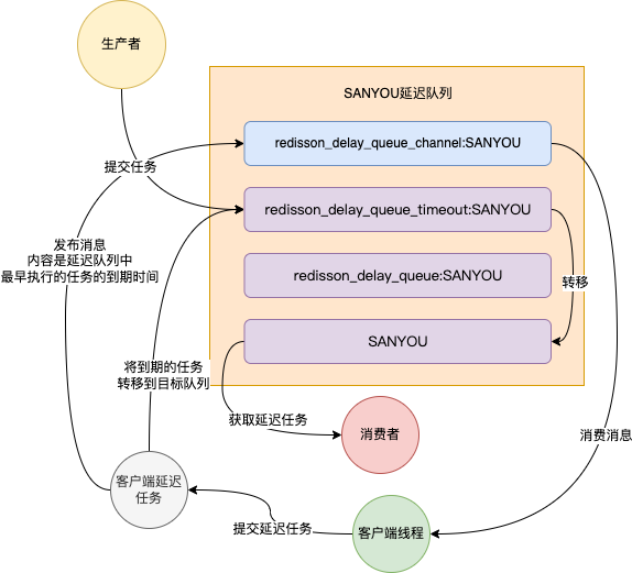 如图,生产者发布了一条消息,内容为sanyou,那么两个消费者都可以同时收到sanyou这条消息。 所以,如果通过监听channel来获取延迟任务,那么一旦服务实例有多个的话,还得保证消息不能重复处理,额外地增加了代码开发量。 接收到所有key的某个事件 这个不属于Redis发布订阅模式的问题,而是Redis本身事件通知的问题。 当监听了__keyevent@<db>__:expired的channel,那么所有的Redis的key只要发生了过期事件都会被通知给消费者,不管这个key是不是消费者想接收到的。 所以如果你只想消费某一类消息的key,那么还得自行加一些标记,比如消息的key加个前缀,消费的时候判断一下带前缀的key就是需要消费的任务。 Redisson的RDelayedQueueRedisson他是Redis的儿子(Redis son),基于Redis实现了非常多的功能,其中最常使用的就是Redis分布式锁的实现,但是除了实现Redis分布式锁之外,它还实现了延迟队列的功能。 先来个demo引入pom。 复制<dependency> <groupId>org.redisson</groupId> <artifactId>redisson</artifactId> <version>3.13.1</version> </dependency>1.2.3.4.5. 封装了一个RedissonDelayQueue类。 复制@Component @Slf4j public class RedissonDelayQueue { private RedissonClient redissonClient; private RDelayedQueue<String> delayQueue; private RBlockingQueue<String> blockingQueue; @PostConstruct public void init() { initDelayQueue(); startDelayQueueConsumer(); } private void initDelayQueue() { Config config = new Config(); SingleServerConfig serverConfig = config.useSingleServer(); serverConfig.setAddress("redis://localhost:6379"); redissonClient = Redisson.create(config); blockingQueue = redissonClient.getBlockingQueue("SANYOU"); delayQueue = redissonClient.getDelayedQueue(blockingQueue); } private void startDelayQueueConsumer() { new Thread(() -> { while (true) { try { String task = blockingQueue.take(); log.info("接收到延迟任务:{}", task);} catch (Exception e) { e.printStackTrace(); } } }, "SANYOU-Consumer").start(); } public void offerTask(String task, long seconds) { log.info("添加延迟任务:{} 延迟时间:{}s", task, seconds); delayQueue.offer(task, seconds, TimeUnit.SECONDS);} }1.2.3.4.5.6.7.8.9.10.11.12.13.14.15.16.17.18.19.20.21.22.23.24.25.26.27.28.29.30.31.32.33.34.35.36.37.38.39.40.41.42.43.44. 这个类在创建的时候会去初始化延迟队列,创建一个RedissonClient对象,之后通过RedissonClient对象获取到RDelayedQueue和RBlockingQueue对象,传入的队列名字叫SANYOU,这个名字无所谓。 当延迟队列创建之后,会开启一个延迟任务的消费线程,这个线程会一直从RBlockingQueue中通过take方法阻塞获取延迟任务。 添加任务的时候是通过RDelayedQueue的offer方法添加的。 controller类,通过接口添加任务,延迟时间为5s。 复制@RestController public class RedissonDelayQueueController { @Resource private RedissonDelayQueue redissonDelayQueue; @GetMapping("/add") public void addTask(@RequestParam("task") String task) { redissonDelayQueue.offerTask(task, 5); } }1.2.3.4.5.6.7.8.9.10.11.12. 启动项目,在浏览器输入如下连接,添加任务。 http://localhost:8080/add?task=sanyou静静等待5s,成功获取到任务。 图片 实现原理如下是Redisson延迟队列的实现原理: 图片