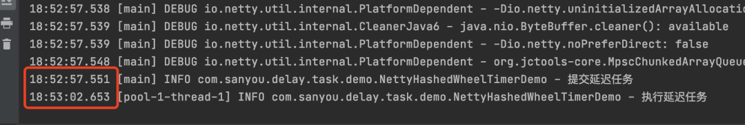 SANYOU前面的前缀都是固定的,Redisson创建的时候会拼上前缀。 redisson_delay_queue_timeout:SANYOU,sorted set数据类型,存放所有延迟任务,按照延迟任务的到期时间戳(提交任务时的时间戳 + 延迟时间)来排序的,所以列表的最前面的第一个元素就是整个延迟队列中最早要被执行的任务,这个概念很重要redisson_delay_queue:SANYOU,list数据类型,也是存放所有的任务,但是研究下来发现好像没什么用。。SANYOU,list数据类型,被称为目标队列,这个里面存放的任务都是已经到了延迟时间的,可以被消费者获取的任务,所以上面demo中的RBlockingQueue的take方法是从这个目标队列中获取到任务的redisson_delay_queue_channel:SANYOU,是一个channel,用来通知客户端开启一个延迟任务任务提交的时候,Redisson会将任务放到redisson_delay_queue_timeout:SANYOU中,分数就是提交任务的时间戳+延迟时间,就是延迟任务的到期时间戳。 Redisson客户端内部通过监听redisson_delay_queue_channel:SANYOU这个channel来提交一个延迟任务,这个延迟任务能够保证将redisson_delay_queue_timeout:SANYOU中到了延迟时间的任务从redisson_delay_queue_timeout:SANYOU中移除,存到SANYOU这个目标队列中。 于是消费者就可以从SANYOU这个目标队列获取到延迟任务了。 所以从这可以看出,Redisson的延迟任务的实现跟前面说的MQ的实现都是殊途同归,最开始任务放到中间的一个地方,叫做redisson_delay_queue_timeout:SANYOU,然后会开启一个类似于定时任务的一个东西,去判断这个中间地方的消息是否到了延迟时间,到了再放到最终的目标的队列供消费者消费。 Redisson的这种实现方式比监听Redis过期key的实现方式更加可靠,因为消息都存在list和sorted set数据类型中,所以消息很少丢。 上述说的两种Redis的方案更详细的介绍,可以查看我之前写的用Redis实现延迟队列,我研究了两种方案,发现并不简单这篇文章。 Netty的HashedWheelTimer先来个demo 复制@Slf4j public class NettyHashedWheelTimerDemo { public static void main(String[] args) { HashedWheelTimer timer = new HashedWheelTimer(100, TimeUnit.MILLISECONDS, 8); timer.start(); log.info("提交延迟任务"); timer.newTimeout(timeout -> log.info("执行延迟任务"), 5, TimeUnit.SECONDS); } }1.2.3.4.5.6.7.8.9.10.11.12. 测试结果: 图片 实现原理 图片
