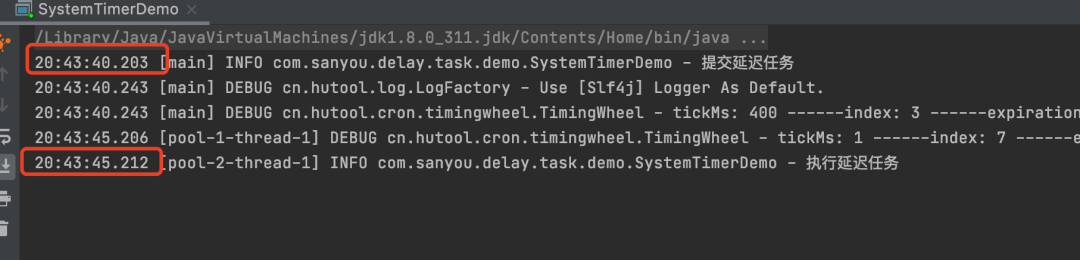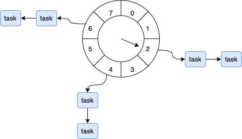 如图,时间轮会被分成很多格子(上述demo中的8就代表了8个格子),一个格子代表一段时间(上述demo中的100就代表一个格子是100ms),所以上述demo中,每800ms会走一圈。 当任务提交的之后,会根据任务的到期时间进行hash取模,计算出这个任务的执行时间所在具体的格子,然后添加到这个格子中,通过如果这个格子有多个任务,会用链表来保存。所以这个任务的添加有点像HashMap储存元素的原理。 HashedWheelTimer内部会开启一个线程,轮询每个格子,找到到了延迟时间的任务,然后执行。 由于HashedWheelTimer也是单线程来处理任务,所以跟Timer一样,长时间运行的任务会导致其他任务的延时处理。 前面Redisson中提到的客户端延迟任务就是基于Netty的HashedWheelTimer实现的。 Hutool的SystemTimerHutool工具类也提供了延迟任务的实现SystemTimer demo 复制@Slf4j public class SystemTimerDemo { public static void main(String[] args) { SystemTimer systemTimer = new SystemTimer(); systemTimer.start(); log.info("提交延迟任务"); systemTimer.addTask(new TimerTask(() -> log.info("执行延迟任务"), 5000)); } }1.2.3.4.5.6.7.8.9.10.11.12. 执行结果 图片