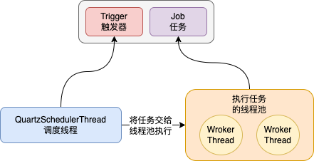 Hutool底层其实也用到了时间轮。 QurtazQurtaz是一款开源作业调度框架,基于Qurtaz提供的api也可以实现延迟任务的功能。 demo依赖 复制<dependency> <groupId>org.quartz-scheduler</groupId> <artifactId>quartz</artifactId> <version>2.3.2</version> </dependency>1.2.3.4.5. SanYouJob实现Job接口,当任务到达执行时间的时候会调用execute的实现,从context可以获取到任务的内容。 复制@Slf4j public class SanYouJob implements Job { @Override public void execute(JobExecutionContext context) throws JobExecutionException { JobDetail jobDetail = context.getJobDetail(); JobDataMap jobDataMap = jobDetail.getJobDataMap(); log.info("获取到延迟任务:{}", jobDataMap.get("delayTask"));} }1.2.3.4.5.6.7.8.9. 测试类 复制public class QuartzDemo { public static void main(String[] args) throws SchedulerException, InterruptedException { // 1.创建Scheduler的工厂 SchedulerFactory sf = new StdSchedulerFactory(); // 2.从工厂中获取调度器实例 Scheduler scheduler = sf.getScheduler(); // 6.启动 调度器 scheduler.start(); // 3.创建JobDetail,Job类型就是上面说的SanYouJob JobDetail jb = JobBuilder.newJob(SanYouJob.class) .usingJobData("delayTask", "这是一个延迟任务") .build(); // 4.创建Trigger Trigger t = TriggerBuilder.newTrigger() //任务的触发时间就是延迟任务到的延迟时间 .startAt(DateUtil.offsetSecond(new Date(), 5)) .build(); // 5.注册任务和定时器 log.info("提交延迟任务"); scheduler.scheduleJob(jb, t); } }1.2.3.4.5.6.7.8.9.10.11.12.13.14.15.16.17.18.19.20.21.22.23.24.25.26.27. 执行结果: 图片 实现原理核心组件 Job:表示一个任务,execute方法的实现是对任务的执行逻辑JobDetail:任务的详情,可以设置任务需要的参数等信息Trigger:触发器,是用来触发业务的执行,比如说指定5s后触发任务,那么任务就会在5s后触发Scheduler:调度器,内部可以注册多个任务和对应任务的触发器,之后会调度任务的执行 图片