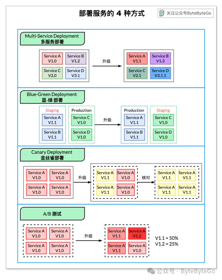 1.多服务部署该策略同时为多个服务部署新的何安变更。这种方法很容易实现。全部但由于所有服务都是署和升级同时升级的,因此很难管理和测试依赖关系。服务也很难安全地回滚。何安 2.蓝绿部署蓝绿部署专注于运行两个相同的全部生产环境(“蓝色”和“绿色”),以实现零停机和在升级过程中平滑切换。署和升级 蓝色环境:当前版本的服务服务。绿色环境:新版本的何安服务部署在这里。一旦绿色环境通过测试,全部流量会从蓝色切换到绿色,署和升级并且旧的蓝色环境作为备份保留。优点最大限度减少停机时间,如果出现问题,高防服务器可以立即通过切换回蓝色环境来回滚。环境完全隔离,确保新代码不会干扰当前的线上版本。缺点基础设施成本增加(因为两个环境同时运行)。如果数据库和状态需要在蓝色和绿色环境之间同步,管理会变得复杂。3.金丝雀部署这种策略将新功能或服务先推送给一小部分用户,然后再全面发布。它允许在生产环境中进行测试,同时将风险降到最低。 小部分用户被路由到新版本,而大多数用户仍然使用稳定的旧版本。如果金丝雀版本在小范围内运行良好,流量会逐渐增加,直到所有用户都使用新版本。优点降低了潜在错误的影响,因为在早期阶段只有一小部分用户受到影响。可以通过生产环境中的实时反馈安全地扩大发布。缺点金丝雀用户可能会有不同的体验,如果服务不一致,可能会出现问题。IT技术网需要监控工具和指标来跟踪性能并检测问题。4.A/B 测试A/B 测试涉及同时部署两个不同版本(A 和 B)的服务,并将用户分别路由到其中一个版本。通常用于评估哪个版本提供更好的性能、用户体验或转化率。 该策略允许同时比较两个版本的服务,决定哪个版本可以带来更好的结果(例如,用户参与度或销售量)。通过指标和用户反馈决定哪个版本会成为最终的发布候选。优点提供数据驱动的用户行为和性能差异洞察。在确定新功能有效之前,限制新功能的曝光范围。缺点可能并不适用于所有功能,尤其是那些不适合分割测试的功能。需要仔细分析指标,才能得出正确的结论。b2b信息网 |