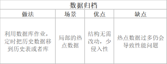 数据库的优化方案核心本质有三种:减少数据量、用空间换性能、选择合适的存储系统,这也对应了开篇讲解的慢的三个原因:数据总量、高负载、查找的时间复杂度。 这里大概解释下收益类型:短期收益,处理成本低,能紧急应对,久了则会有技术债务;长期收益则跟短期收益相反,短期内处理成本高,但是效果能长久使用,扩展性会更好。 静态数据意思是,相对改动频率比较低的,也无需过多联表的,where 过滤比较少。动态数据与之相反,更新频率高,通过动态条件筛选过滤。 减少数据量减少数据量类型共有四种方案:数据序列化存储、数据归档、中间表生成、分库分表。 就如上面所说的,无论是哪种存储,数据量越少,自然查询性能就越高,随着数据量增多,资源的消耗(CPU、磁盘读写繁忙)、耗时也会越来越高。 目前市面上的 NoSQL 基本上都支持分片存储,所以其天然分布式写的能力从数据量上能得到非常的解决方案。 而关系型数据库,查找算法与存储结构是可以优化的空间比较少,因此咱们一般思考出发点只有从如何减少数据量的这个角度进行选择优化,因此本类型的优化方案主要针对关系型数据库进行处理。  1)数据归档