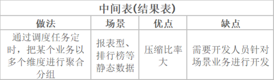 注意点:别一次性迁移数量过多,建议低频率多次限量迁移。像 MySQL 由于删除数据后是不会释放空间的,可以执行命令 OPTIMIZE TABLE 释放存储空间,但是会锁表,如果存储空间还满足,可以不执行。 建议优先考虑该方案,主要通过数据库作业把非热点数据迁移到历史表,如果需要查历史数据,可新增业务入口路由到对应的历史表(库)。  2)中间表(结果表)