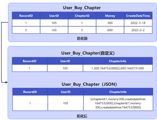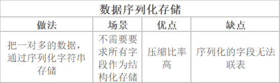 中间表(结果表)其实就是利用调度任务把复杂查询的结果跑出来存储到一张额外的物理表,因为这张物理表存放的是通过跑批汇总后的数据,因此可以理解成根据原有的业务进行了高度的数据压缩。 以报表为例,如果一个月的源数据有数十万,我们通过调度任务以月的维度生成,那么等于把原有的数据压缩了几十万分之一。 接下来的季报和年报可以根据月报*N 来进行统计,以这种方式处理的数据,就算三年、五年甚至十年数据量都可以在接受范围之内,而且可以精确计算得到。那么数据的压缩比率是否越低越好? 下面有一段口诀: 字段越多,粒度越细,灵活性越高,可以以中间表进行不同业务联表处理。字段越少,粒度越粗,灵活性越低,一般作为结果表查询出来。3)数据序列化存储