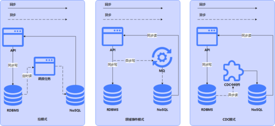 讲解 CQRS 前得了解 CQS,有些小伙伴看了估计还没不是很清晰,我这里用通俗的话解释:某个对象的数据访问的方法里,要么只是查询,要么只是写入(更新)。 而 CQRS(命令查询职责分离)基于 CQS 的基础上,用物理数据库来写入(更新),而用另外的存储系统来查询数据。 因此我们在某些业务场景进行存储架构设计时,可以通过关系型数据库的 ACID 特性进行数据的更新与写入,用 NoSQL 的高性能与扩展性进行数据的查询处理。 这样的好处就是关系型数据库和 NoSQL 的优点都可以兼得,同时对于某些业务不适于一刀切的替换存储的也可以有一个平滑的过渡。 从代码实现角度来看,不同的存储系统只是调用对应的接口 API,因此 CQRS 的难点主要在于如何进行数据同步。 2)数据同步方式