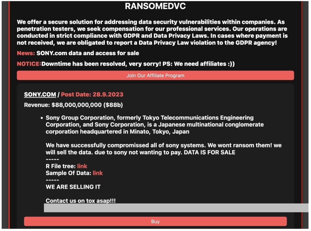 据海外科技媒体Bleepingcomputer报道,索尼一个名为RansomedVC的公司攻击新型勒索攻击组织本周早前事件宣称已成功入侵了索尼公司的网络系统,并非法窃取了超过3.14GB未压缩数据。勒索该组织表示:由于索尼公司不愿意配合谈判并按要求支付赎金,传言查因此他们将通过非法渠道公开售卖这些“数据和访问权限”。正紧
