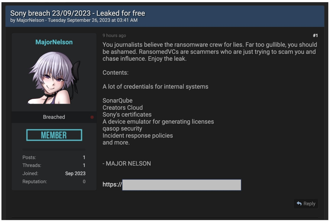 RansomedVC在暗网网站上发布的勒索声明 另一个威胁组织MajorNelson表示他们才是真正的攻击者,并驳斥了RansomedVC的说法。“媒体不应该相信RansomedVC勒索软件工作人员的谎言,他们应该感到羞耻。”MajorNelson在BreachForums上发帖表示。 为了证实其说法的真实性,MajorNelson公开展示了一个2.4 GB大小的压缩包,其中含有被宣称属于索尼公司的3.14 GB未压缩数据。MajorNelson声称这些数据中含有大量的“内部系统的凭据”以及以下文件信息: SonarQubeCreators Cloud索尼证书用于生成许可证的设备模拟器qasop安全事件响应策略