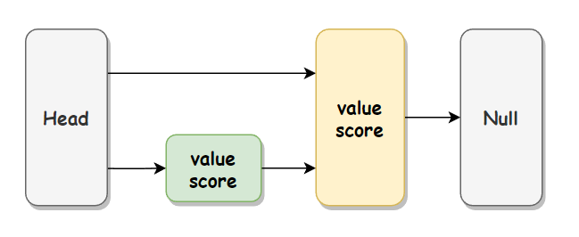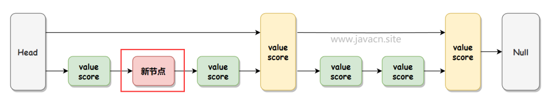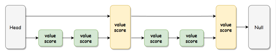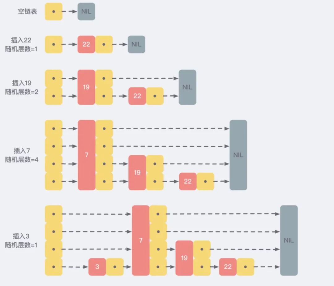 这样就不满足制定的上层节点跨越下层两个节点的规则了,就需要额外的调整上层中的所有节点,这样程序的效率就降低了,所以使用随机层数,不强制制定规则,这样就不需要进行额外的操作,从而也就不会占用服务执行的时间了。 添加流程Redis 中跳跃表的添加流程如下图所示:  第一个元素添加到最底层的有序链表中(最底层存储了所有元素数据)。第二个元素生成的随机层数是 2,所以再增加 1 层,并将此元素存储在第 1 层和最低层。第三个元素生成的随机层数是 4,所以再增加 2 层,整个跳跃表变成了 4 层,将此元素保存到所有层中。第四个元素生成的随机层数是 1,所以把它按顺序保存到最后一层中即可。其他新增节点以此类推。 随机层数源码分析随机层数的源码在 t_zset.c/zslRandomLevel(void) 中,如下所示: 复制int zslRandomLevel(void) { int level = 1; while ((random()&0xFFFF) < (ZSKIPLIST_P * 0xFFFF)) level += 1; return (level<ZSKIPLIST_MAXLEVEL) ? level : ZSKIPLIST_MAXLEVEL; }1.2.3.4.5.6. 从源码可知,随机层数有 50% 的概率被分配到 Level 1,25% 的概率被分配到 Level 2,12.5% 的概率被分配到 Level 3,以此类推。 Redis 跳跃表默认允许最大的层数是 32,此值在 ZSKIPLIST_MAXLEVEL 源码中被定义。 小结跳跃表是由多个有序的链表组成的,最底层存储了所有元素的数据,这样存储让它的查询效率更高,查询复杂度从 O(n) 变为了 O(log n)。跳跃表的添加流程是根据节点生成的随机层数,将它插入到最底层节点和上层的 N-1 层节点中,描述添加流程的关键就是理解随机层数以及其背后的原理。 参考 & 鸣谢https://segmentfault.com/a/1190000022028505。 |