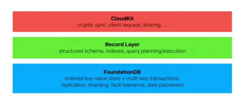 从GitHub上的描述来看,Record Layer是一个基于FoundationDB的Java API,它提供了一种面向记录的存储方式,可以大致类比为一个简单的关系型数据库。具体特性包括: 1、结构化类型:记录以Protocol Buffer(protobuf)消息的形式进行定义和存储,Protocol Buffer是一种最初由Google设计的数据序列化协议。 2、索引:Record Layer支持多种索引类型,如值索引(大多数数据库都提供的那种)、排名索引和聚合索引。索引和主键可以通过protobuf选项或程序化方式来定义。 3、复杂类型:支持复杂数据类型,例如列表和嵌套记录,并且能够针对这些嵌套结构定义索引。 4、查询功能:虽然Record Layer并未提供查询语言,但它提供了API接口,支持对一个或多个记录类型进行扫描、过滤和排序操作,同时还包含一个能够自动选择合适索引的查询规划器。 5、多个记录存储与共享模式:Record Layer允许创建并管理多个独立的记录存储实例,所有实例都采用共享(且可动态演变)的模式。举例来说,不同于在一个单一数据库中存储所有用户数据的方式,每个用户可以拥有自己的记录存储,甚至可以根据需要跨不同的FDB集群实例进行分片处理。 6、极轻量级:Record Layer被设计用于大型、分布式、无状态环境,旨在实现从打开存储到执行首次查询之间的时间间隔达到毫秒级别。 7、扩展性强:新的索引类型以及自定义索引键表达式可以动态地融入到记录存储中。 根据FoundationDB Record Layer论文所述,苹果使用FoundationDB Record Layer为服务数亿用户的大型应用提供强大的抽象层支持。CloudKit 使用Record Layer来托管数十亿个独立的数据库,其中许多数据库共享相同的模式(schema)。 四、为什么要使用 FoundationDB Record LayerFoundationDB、Record Layer 和 CloudKit 的结构如下所示: 来源:《FoundationDB Record Layer: 开源结构化存储》 FoundationDB 负责所有的分布式系统和并发控制工作。Record Layer 作为中间层,充当了关系数据库,以便开发者能够更轻松地与 FoundationDB 进行交互。CloudKit 是最顶层的服务,为应用开发者提供了丰富的功能和API。虽然CloudKit是构建在Record Layer之上的一个典型应用案例,但内部还有其他服务和组件也基于Record Layer构建,比如用于处理JSON文档存储等需要结构化存储的场景。Record Layer 使苹果能够在大规模上实现多租户支持。 实际上,这样的描述可能还显得保守了。 Record Layer 被用于极端的多租户环境,其中每个应用程序的每个用户都能获得独立的记录存储空间。这意味着Record Layer 托管着数十亿个共享数千种模式的独立数据库。 来源:《FoundationDB Record Layer: 开源结构化存储》