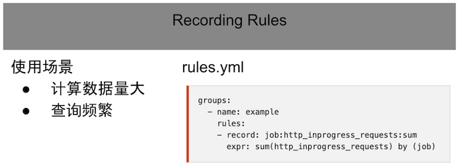 如此,Promtheus体系的能力不弱于监控界的“数据仓库”+“计算平台”。因此,在大数据的开始在业界得到应用,就能明白,这就是监控未来的方向。 一次计算,处处查询当然,如此强大的计算能力,消耗的资源也是挺恐怖的。因此,查询预计算结果通常比每次需要原始表达式都要快得多,尤其是在仪表盘和告警规则的适用场景中,仪表盘每次刷新都需要重复查询相同的表达式,告警规则每次运算也是如此。因此,Prometheus提供了 Recoding rules,可以预先计算经常需要或者计算量大的表达式,并将其结果保存为一组新的时间序列, 达到 一次计算,多次查询的目的。