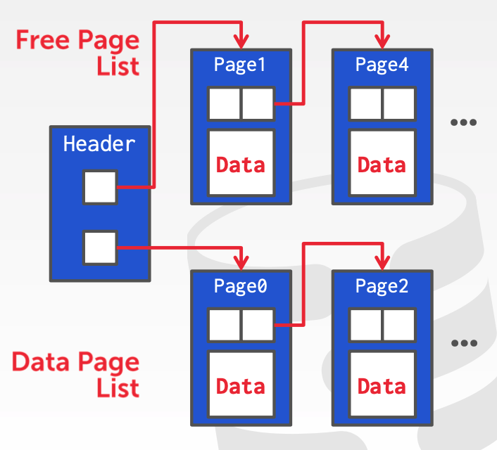 在数据库系统中,page 肯定不止一个,那么如此多的 page 之间,需要进行统一管理,例如增加一个 page、删除一个 page、遍历所有的 page 等,该怎么组织这些 page 来实现这些目的呢? 最常见的组织方式叫做 heap file,heap file 指的是一个无序的 page 集合,page 是随机进行排列的。 heap file 有两种常见的组织方式: linked listpage directorylinked list 是按照链表的方式组织 page,链表头有两个指针,一个指向 free page list,表示空闲的 page 列表,一个指向 data page list,指向实际存储数据的 page。