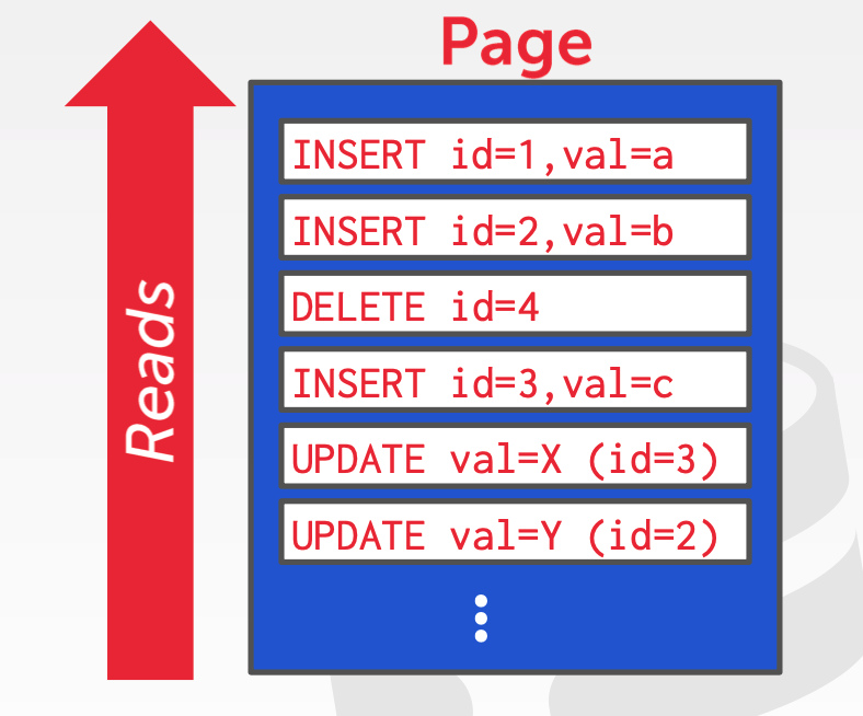 Page 组织方式 log structuredpage 中数据可以通过类似日志的方式组织,即对 tuple 的增删操作都以日志追加的方式写到 page 中,这样做的最大好处是可以利用顺序 IO,写性能能够得到提升。