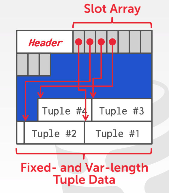 但是这种 log 式的组织方式,需要进行数据的回收处理(compaction),并且在读数据的时候,因为数据存在新旧多个版本,可能会有额外的磁盘 IO 消耗。 日志组织方式对于写多读少的应用非常合适,一些 NoSQL 引擎例如 leveldb、rocksdb、HBase 都采用了这种方式,但是在关系型数据库中,这种方式并不是主流。 slotted pagepage 的内部结构,关系型数据库中常用的组织方式叫做 slotted page,其大致结构如下: