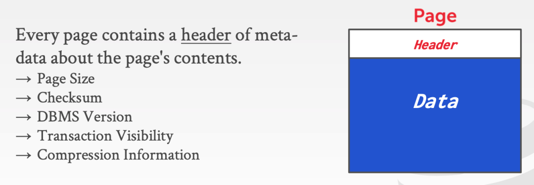 page 最靠前的部分,叫做 page header,这通常是由一个固定 size, header 中通常包含一些关于此 page 的元数据,例如 page 大小、校验和、DB 版本、事务信息、数据压缩信息。