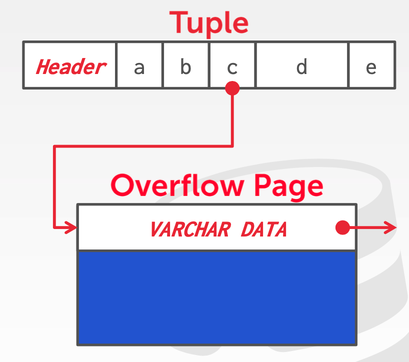 header 之后的部分叫做 slot array,每一个 solt array 都存储了 tuple 的开始位置,这样能够快速定位到每条记录。 例如 postgres 中对于每条记录都有一个隐藏的 CTID,记录的是该 tuple 的物理位置,其内容是 page id + offset,即 tuple 所在页的 id,以及在页内的位置。 复制select *, ctid from some_table;1. 每个 tuple 实际上就是一个不定长的字节序列,里面存储了具体的数据信息。 读者有兴趣的话可以再看下 postgres 的磁盘 page 结构,与这里的 slotted page 基本上是一致的,代码:https://github.com/postgres/postgres/blob/master/src/include/storage/bufpage.h Large Values前面提到了一个 page 通常都有固定的 size,那么如果存储的数据太大,超过了 page 的大小,应该怎样存储这些数据呢? 最常见的方式是使用一个额外的 page 来存储,原来的 page 中保存一个指向它的指针,如果数据仍然很大,额外的 page 还是放不下,那么可以在新开一个 page,并且由上一个 page 指向它。