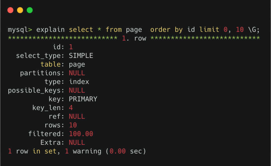 回表 但不管是主键还是非主键索引,他们的叶子结点数据都是有序的。比如在主键索引中,这些数据是根据主键id的大小,从小到大,进行排序的。 基于主键索引的limit执行过程那么回到文章开头的问题里。 当我们去掉explain,执行这条sql。 复制select * from page order by id limit 0, 10;1.                                                                上面select后面带的是星号*,也就是要求获得行数据的所有字段信息。 server层会调用innodb的接口,在innodb里的主键索引中获取到第0到10条完整行数据,依次返回给server层,并放到server层的结果集中,返回给客户端。 而当我们把offset搞离谱点,比如执行的是; 复制select * from page order by id limit 6000000, 10;1.                                                                server层会调用innodb的接口,由于这次的offset=6000000,会在innodb里的主键索引中获取到第0到(6000000 +            10)条完整行数据,返回给server层之后根据offset的值挨个抛弃,最后只留下最后面的size条,也就是10条数据,放到server层的结果集中,返回给客户端。 可以看出,当offset非0时,server层会从引擎层获取到很多无用的数据,而获取的这些无用数据都是要耗时的。 因此,我们就知道了文章开头的问题的答案,mysql查询中 limit 1000,10 会比 limit 10 更慢。原因是 limit 1000,10            会取出1000+10条数据,并抛弃前1000条,这部分耗时更大 那这种case有办法优化吗? 可以看出,当offset非0时,server层会从引擎层获取到很多无用的数据,而当select后面是*号时,就需要拷贝完整的行信息,拷贝完整数据跟只拷贝行数据里的其中一两个列字段耗时是不同的,这就让原本就耗时的操作变得更加离谱。 因为前面的offset条数据最后都是不要的,就算将完整字段都拷贝来了又有什么用呢,所以我们可以将sql语句修改成下面这样。 复制select * from page where id >=(select id from page order by id limit 6000000, 1) order by id limit 10;1.                                                                上面这条sql语句,里面先执行子查询 select id from page order by id limit 6000000, 1,            这个操作,其实也是将在innodb中的主键索引中获取到6000000+1条数据,然后server层会抛弃前6000000条,只保留最后一条数据的id。 但不同的地方在于,在返回server层的过程中,只会拷贝数据行内的id这一列,而不会拷贝数据行的所有列,当数据量较大时,这部分的耗时还是比较明显的。 在拿到了上面的id之后,假设这个id正好等于6000000,那sql就变成了 复制select * from page where id >=(6000000) order by id limit 10;1.                                                                这样innodb再走一次主键索引,通过B+树快速定位到id=6000000的行数据,时间复杂度是lg(n),然后向后取10条数据。 这样性能确实是提升了,亲测能快一倍左右,属于那种耗时从3s变成1.5s的操作。 这······ 属实有些杯水车薪,有点搓,属于没办法中的办法。 基于非主键索引的limit执行过程上面提到的是主键索引的执行过程,我们再来看下基于非主键索引的limit执行过程。 比如下面的sql语句: 复制select * from page order by user_name limit 0, 10;1.                                                                server层会调用innodb的接口,在innodb里的非主键索引中获取到第0条数据对应的主键id后,回表到主键索引中找到对应的完整行数据,然后返回给server层,server层将其放到结果集中,返回给客户端。 而当offset>0时,且offset的值较小时,逻辑也类似,区别在于,offset>0时会丢弃前面的offset条数据。 也就是说非主键索引的limit过程,比主键索引的limit过程,多了个回表的消耗。 但当offset变得非常大时,比如600万,此时执行explain。