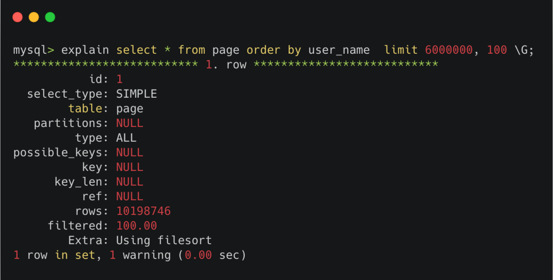 非主键索引offset值超大时走全表扫描 可以看到type那一栏显示的是ALL,也就是全表扫描。 这是因为server层的优化器,会在执行器执行sql语句前,判断下哪种执行计划的代价更小。 很明显,优化器在看到非主键索引的600w次回表之后,摇了摇头,还不如全表一条条记录去判断算了,于是选择了全表扫描。 因此,当limit offset过大时,非主键索引查询非常容易变成全表扫描。是真·性能杀手。 这种情况也能通过一些方式去优化。比如: 复制select * from page t1, (select id from page order by user_name limit 6000000, 100) t2 WHERE t1.id = t2.id;1.                                                                通过select id from page order by user_name limit 6000000,            100。先走innodb层的user_name非主键索引取出id,因为只拿主键id,不需要回表,所以这块性能会稍微快点,在返回server层之后,同样抛弃前600w条数据,保留最后的100个id。然后再用这100个id去跟t1表做id匹配,此时走的是主键索引,将匹配到的100条行数据返回。这样就绕开了之前的600w条数据的回表。 当然,跟上面的case一样,还是没有解决要白拿600w条数据然后抛弃的问题,这也是非常挫的优化。 像这种,当offset变得超大时,比如到了百万千万的量级,问题就突然变得严肃了。 这里就产生了个专门的术语,叫深度分页。 深度分页问题深度分页问题,是个很恶心的问题,恶心就恶心在,这个问题,它其实无解。 不管你是用mysql还是es,你都只能通过一些手段去"减缓"问题的严重性。 遇到这个问题,我们就该回过头来想想。 为什么我们的代码会产生深度分页问题? 它背后的原始需求是什么,我们可以根据这个做一些规避。 如果你是想取出全表的数据有些需求是这样的,我们有一张数据库表,但我们希望将这个数据库表里的所有数据取出,异构到es,或者hive里,这时候如果直接执行 复制select * from page;1.                                                                这个sql一执行,狗看了都摇头。 因为数据量较大,mysql根本没办法一次性获取到全部数据,妥妥超时报错。 于是不少mysql小白会通过limit offset            size分页的形式去分批获取,刚开始都是好的,等慢慢地,哪天数据表变得奇大无比,就有可能出现前面提到的深度分页问题。 这种场景是最好解决的。 我们可以将所有的数据根据id主键进行排序,然后分批次取,将当前批次的最大id作为下次筛选的条件进行查询。 可以看下伪代码: