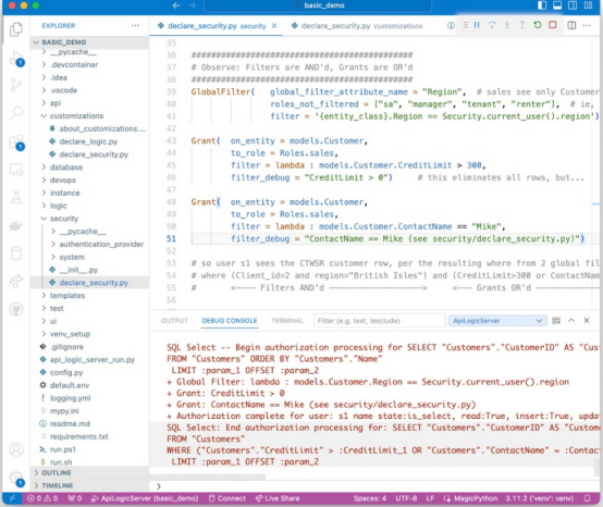 2.在IDE中自定义虽然API/UI自动化是一个很好的开端,但实施逻辑和安全性至关重要。WordPress模板其方法如下: 下面的apply_customization过程模拟向项目添加安全性,并使用IDE在logic/declare_logic.sh和security/declare_security.py中声明逻辑和安全性。声明的安全性和逻辑显示在下面的截图中。 在项目的终端窗口中要应用自定义: (1)停止服务器(红色停止按钮,或Shift-F5 -参见附录) (2)自定义应用 复制# mac, linux sh apply_customizations.sh #windows ./apply_customizations.ps11.2.3.4. 2.1声明安全性 上面的apply_customizations过程模拟了ApiLogicServer add-authcommand,并使用IDE在logic/declare_logic.sh中声明安全性。 以下是声明安全性的过程: (1)启动服务器F5 (2)启动Admin应用程序:http://localhost:5656/ (3)登录账号为s1,密码为p (4)点击客户 注意: (1)管理应用程序现在显示的客户数量已经减少 (2)下面的截图说明了安全声明和操作: 上面代码面板中的声明性授予,等等下面代码面板的日志记录,通过显示应用了哪些授权(+ Grant:)来帮助调试;  2.2声明逻辑 逻辑(多表派生和约束)是数据库系统的重要部分,通常占到将近一半。API逻辑服务器提供类似电子表格的规则,极大地简化和加速逻辑开发。 规则在Python中声明,并通过IDE代码完成简化。下面的屏幕显示了检查信用逻辑的5条规则。 上面的服务器托管apply_customizations过程模拟了使用IDE在logic/declare_logic.sh中声明逻辑的过程。 可以查看运行中的逻辑: (1)在管理应用程序中,注销(右上角),并以管理员(admin)身份登录。 (2)使用管理应用程序为客户1添加订单和项目(见附录)。 观察控制台日志中触发的规则,如下面的屏幕截图所示。 逻辑提供了对过程逻辑的显著改进,如下所述。 A.复杂性扩展 下面的截图显示了逻辑声明和插入项目(Item)的日志记录。每行表示一个规则触发,并显示该行的完整状态。 注意,这是一个多表事务,如缩进所示。这是因为-就像电子表格-规则自动链,包括跨表。  B.代码简洁40倍 5个类似电子表格的规则可以表示与200行代码相同的逻辑,如下所示。这在系统的后端减少了40倍代码。 C.自动再利用 以上的逻辑(可能是为Place order设计的)自动应用于所有事务:删除订单、更改项目、将订单转移给新客户等。这减少了代码,并提高了质量(没有遗漏的极端情况)。 D.自动优化 通过削减和消除昂贵的聚合查询,可以最小化SQL开销。这些可能导致数量级的影响。 E.规则透明 规则是一种可执行的设计。需要注意的是,它们完全映射到自然语言设计(如注释所示),可供业务用户阅读。 可以选择使用Behave TDD方法来定义测试,并且规则报告Rules Report将显示为每个测试执行的规则。 3.使用规则和Python进行迭代类似于电子表格的规则不仅简洁了40倍的代码,而且还有效地简化了维护。举个例子: 购买10件或以上的碳中和产品,给予10%的折扣。 下面的apply_iteration过程模拟迭代: 通过Product.CarbonNeutral获取一个新的数据库。发出ApiLogicServer rebuild-from-database命令,重建项目(数据库模型、API),同时保留上面所做的自定义设置。获取修改后的ui/admin/admin.yaml,在管理应用程序中显示这个新列。获得修改后的逻辑:在logic/declare_logic.py中,将model . item . amount公式的2行替换为以下内容(下一个截图显示了使用断点执行的修订逻辑): 复制def derive_amount(row: models.Item, old_row: models.Item, logic_row: LogicRow): amount = row.Quantity * row.UnitPrice if row.Product.CarbonNeutral and row.Quantity >= 10: amount = amount * Decimal(0.9) # breakpoint here return amount Rule.formula(derive=models.Item.Amount, calling=derive_amount)1.2.3.4.5.6. 要应用这个迭代,在项目的终端窗口中: (1)停止服务器(红色停止按钮,或Shift-F5 -参见附录) (2)应用迭代 复制# mac, linux sh apply_iteration.sh #windows ./apply_iteration.ps11.2.3.4. (3)设置断点,如下图所示。 (4)测试:启动服务器,以管理员身份登录。 (5)使用管理应用程序通过添加12个绿色项目来更新订单。 在断点处,可以使用标准调试器服务来调试逻辑(检查项目属性、步骤等)。