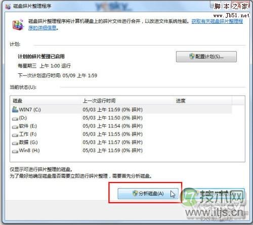 图示:选择多个分区同时进行磁盘碎片检查和整理