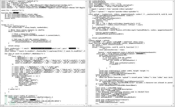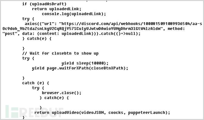 上传恶意视频的代码(卡巴斯基) 卡巴斯基在报告中解释,[upload.exe]使用了 Puppeteer Node 库,提供了一个高级别 API,用于使用 DevTools 协议管理 Chrome 和 Microsoft Edge。当视频成功上传到 YouTube 时,upload.exe 会向 Discord 发送一条信息,并附上上传视频的链接。