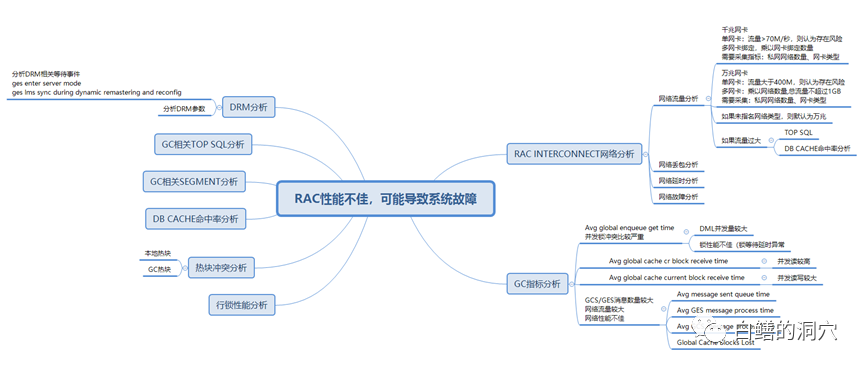 上面的思维导图是专家梳理出来的RAC性能分析的一些常见分析路径,根据专家脑子中的类似的思维导图,人的思维可以根据现实的实际情况进行发散和收敛,灵活度很大,而且不同的专家的思路不一样,其发散与收敛的方法也不一致。不管怎么样,只要专家对RAC问题分析的功力足够,要想定位我说的那个用户RAC故障还是比较容易的。