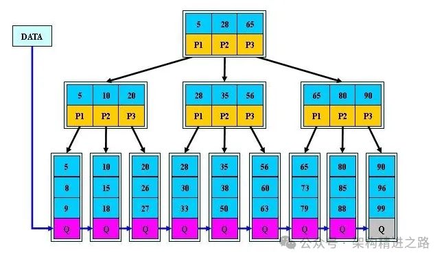 如上图所示,每个节点占用一个盘块的磁盘空间,一个节点上有两个升序排序的关键字和三个指向子树根节点的指针,指针存储的是子节点所在磁盘块的地址。 2.5 B-Tree vs B+Tree对于B-Tree和B+Tree,我们该如何选择呢?结合场景来做分析更靠谱。 让我们来想想平时的高频查询场景吧,大概存在如下几种: 按照id查询唯一一条记录 查找某个范围的所有记录接下来,just do it! 2.5.1 场景:按照id查询唯一一条记录 图片
