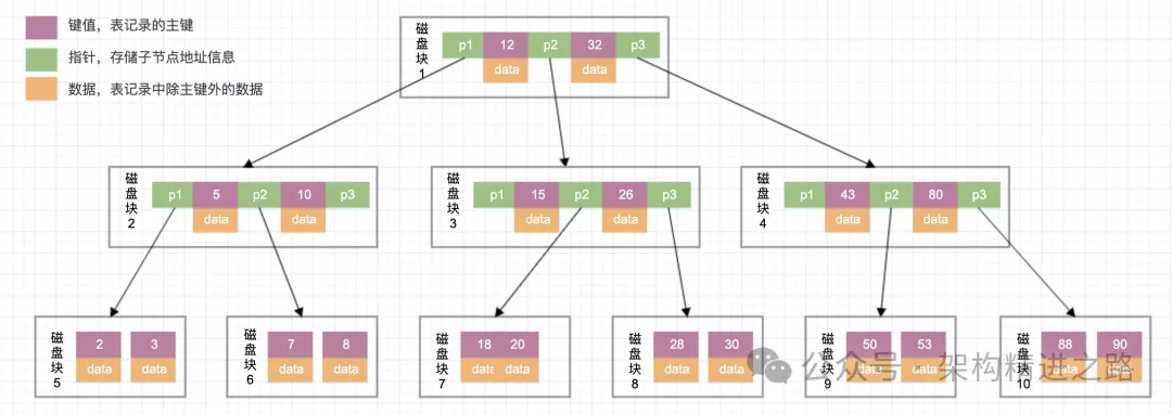 如果数据都存储在内存中,采用AVL树来存储,还是可以的,查询效率非常高。不过我们的数据是存在磁盘中,用过采用这种结构,每个节点对应一个磁盘块,数据量大的时候,也会和二叉树一样,会导致树的高度变高,这样逻辑上很近的节点实际可能非常远,无法很好的利用磁盘预读(局部性原理),会增加IO次数,显然用这种结构存储数据也是不可取的。 2.3 B-树B树(英语:B-tree),这里的 B 表示 balance( 平衡的意思),是一种自平衡的树,能够保持数据有序,B-树允许每个节点有更多的子节点。 如图所示: 图片