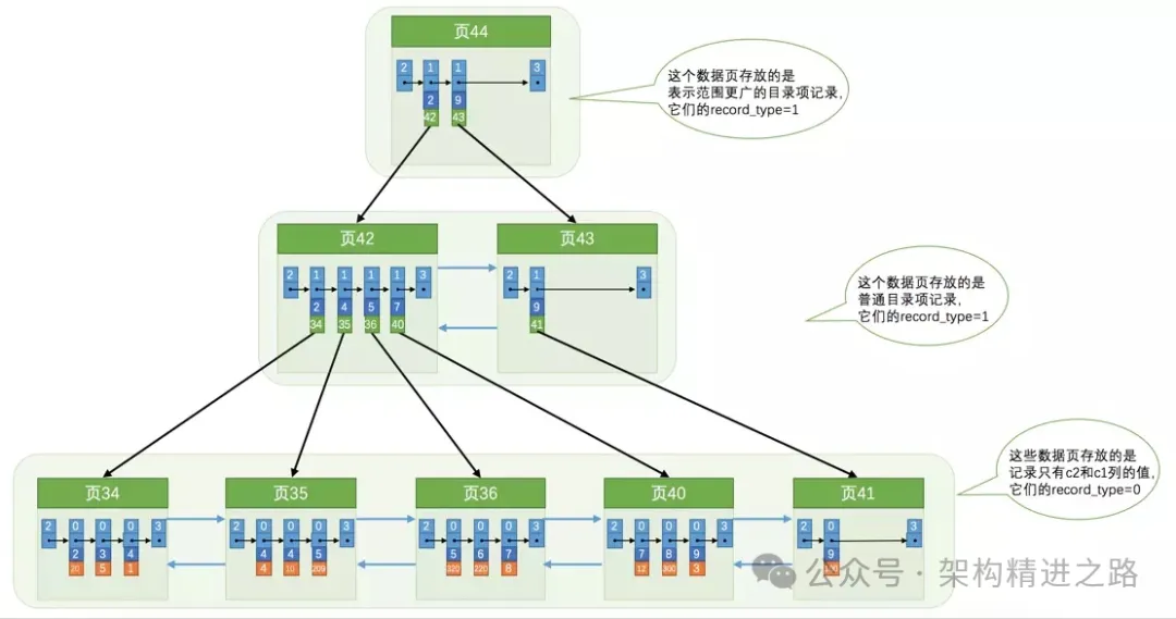 现在如果我们想根据主键值查找一条用户记录大致需要3个步骤,以查找主键值为20的记录为例: 1、确定目录项记录页。 2、通过目录项记录页确定用户记录真实所在的页。 3、在真实存储用户记录的页中定位到具体的记录。 四、InnoDB中的索引分类InnoDB 中的索引类别介绍,明确后期应用注意事项。 4.1 聚簇索引上边介绍的B+树索引。它有两个特点: 1.根据记录主键值的大小进行记录和页的排序 这包括三个方面的含义: 页内的记录是按照主键的大小顺序排成一个单向链表。各个存放用户记录的页也是根据主键大小顺序排成一个双向链表。存放目录项记录的页分为不同的层次,在同一层次中的页也是根据页中目录项记录的主键大小顺序排成一个双向链表。2.B+树的叶子节点存储的是完整的用户记录 我们把具有这两种特性的B+树称为聚簇索引,所有完整的用户记录都存放在这个聚簇索引的叶子节点处。 4.2 二级索引上边介绍的聚簇索引只能在搜索条件是主键值时才能发挥作用,因为B+树中的数据都是按照主键进行排序的。 那如果我们想以别的列作为搜索条件该咋办呢? 难道只能从头到尾沿着链表依次遍历记录么? 我们可以多建几棵B+树,不同的B+树中的数据采用不同的排序规则。比方说我们用c2列的大小作为数据页、页中记录的排序规则,再建一棵B+树,效果如下图所示: 图片