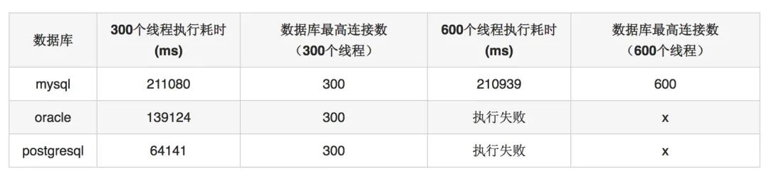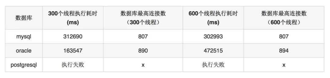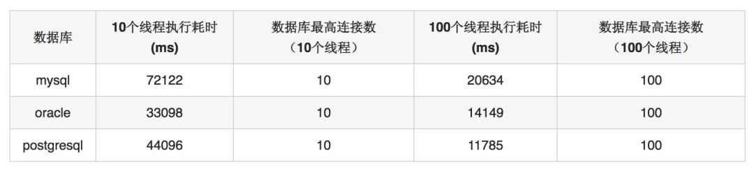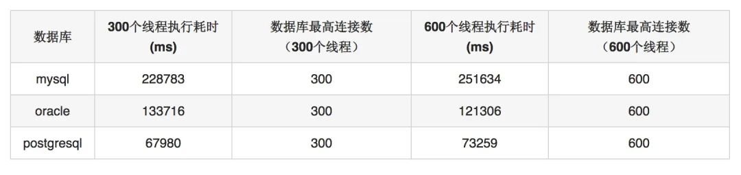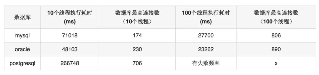 从上面测试结果,我们可以基本得出如下结论: 从数据连接池性能角度看:druid性能比较稳定,dbcp、c3p0都有某种程度的执行失败。从数据库性能角度看:postgresql > oracle > mysql。 还是一样的结论,druid对postgresql的支持性能最好,c3p0的表现比较差! 四、小结从上面的测试结果,我们可以很清晰的看到,在数据连接池方面,druid和dbcp旗鼓相当,而并发方面druid的稳定性大于dbcp,c3p0相比druid和dbcp,稳定性和执行速度要弱些。 在数据库方面,postgresql速度要优于oracle,而oracle对各个数据源的支持和稳定性要有优势,mysql相比oracle和postgresql,执行速度要弱些。 如果在实际开发中,数据源连接池推荐采用druid,数据库的选用方面 postgresql > oracle > mysql。 |