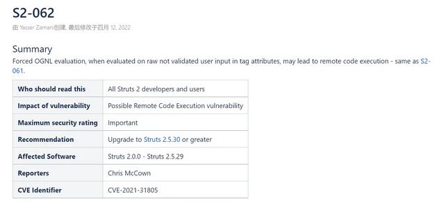 在 2020 年,云服务器中两重漏GitHub 的年前研究人员 Alvaro Munoz 和 Aeye 安全实验室的 Masato Anzai 报告了 Struts 2 版本 2.0.0 - 2.5.25 在某些情况下存在一个 OGNL 注入漏洞,编号为 CVE-2020-17530,严洞重丁在 CVSS 严重性方面获得了 9.8 分(满分 10 分)。现官 “如果开发者使用 %{...} 语法进行强制 OGNL 评估,布补标签的一些属性仍然可以执行双重评估。对不信任的用户输入使用强制 OGNL 评估可能导致远程代码执行和安全性能下降。” 对象图导航语言 (Object-Graph Navigation Language,OGNL) 是一种开源的 Java 表达式语言,简化了 Java 语言中的表达式范围。它被集成在 Struts2 等框架中,作用是对数据进行访问;拥有类型转换、IT技术网访问对象方法、操作集合对象等功能。 尽管 Apache 在 Struts 2.5.26 中解决了 2020 年所报告的漏洞,但研究人员 Chris McCown 发现,所应用的修复方案并不完整。他向 Apache 报告称,“双重评估”问题仍然可以在 Struts 版本 2.5.26 及更高版本中重现。 作为解决措施,Apache 方面建议开发人员避免基于不受信任的用户输入在标签属性中使用强制 OGNL 评估,和/或升级到 Struts 2.5.30 或更高版本,以检查表达式评估是否不会导致双重评估。并建议遵循安全指南以获得最佳实践。 本文转自OSCHINA 本文标题:Apache Struts 中两年前的严重漏洞重现,云南idc服务商官方发布补丁 本文地址:https://www.oschina.net/news/191310/apache-struts-bug-new-patch |