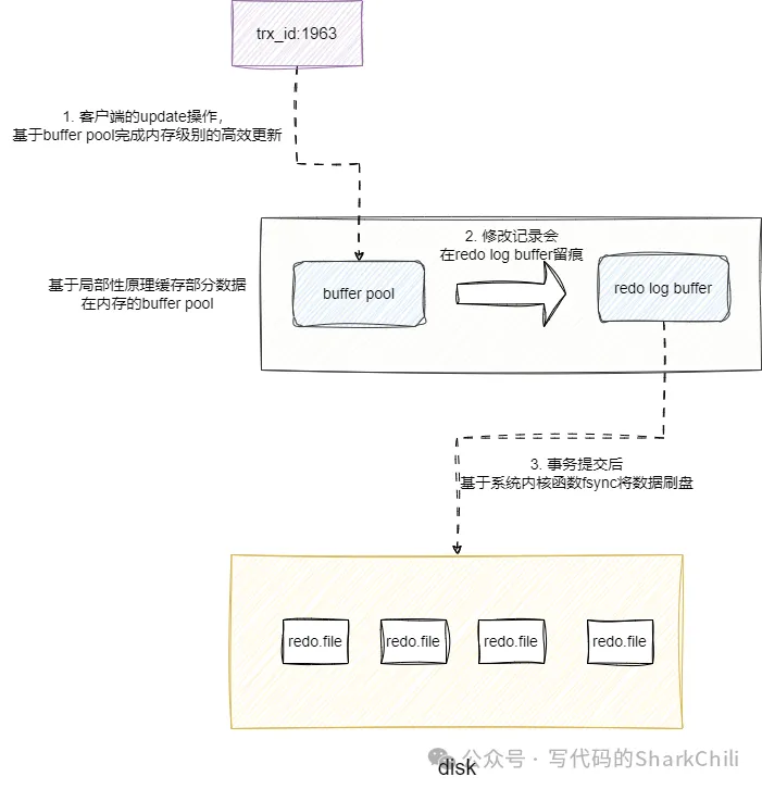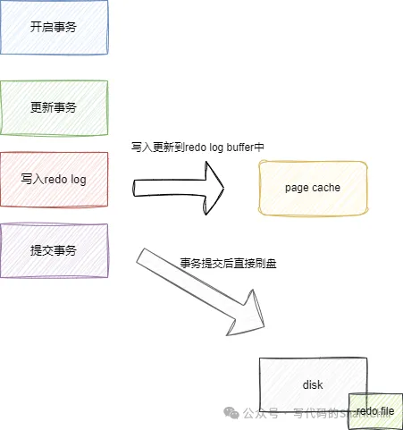 配置为2时,每当事务提交后,redo log就会刷入内核缓冲区,这些数据具体何时刷盘则交由操作系统决定,这种情况在MySQL宕机情况下不会造成数据丢失,一旦操作系统崩溃则可能会造成内核缓冲区的redo log数据丢失,导致进行数据备份还原时丢失一部分数据:  redo log的日志文件组redo log并不是网站模板单指一个文件,它是由一组日志文件构成的,如下图所示,这些文件大小都是一样的,写入操作时依次从从1开始写,文件1写满了,就将数据写到文件2,最后写到文件4。 redolog通过write pos标记当前写入的位置,每次完成写入write pos标志位后移,一旦write pos和checkpoint相遇时就说明文件满了,此时innodb就会通过让checkpoint往后移进行一些空间数据擦除,以此来保证一个足够空间容纳新数据。  为什么InnoDB不直接将数据写入磁盘页是操作系统的基本单位,一页差不多16kb,而我们每次操作的数据可能也就x byte,为了x byte的数据操作将一页的数据进行同步持久化实在有些大材小用了,所以通过redo log buffer记录修改内容,通过刷盘策略进行数据刷盘更新,由此提升数据库的并发能力:  bin.log和redo.log对应的二阶段提交经常有读者面试被问道的为什么我有了redo.log,你还需要bin log呢?而且这两个日志我到底要先写哪个才能保证主从数据库的一致性呢? 对此我们不妨用反正法来说明: 假设我们先写bin.log,当事务提交后bin.log写入成功,结果再写redo.log期间,数据库挂了。重启恢复后,主数据库根据早期redo.log(我们的redo.log没写入)恢复到bin log写入前的样子,而从数据库已经根据bin.log同步到了一份数据,最终从数据库比主数据库多了一条数据。 我们再假设写redo log,假设事务执行期间我们就写了redo log,在事务提交之后写bin log数据库挂了,我们重启数据库后主主库恢复。主库根据redo log进行灾备恢复,将我们更新的数据同时恢复回来,而从库根据bin log进行数据同步时,并没有察觉到主库刚刚写入的数据,这就导致了从库比主库少了一条数据。