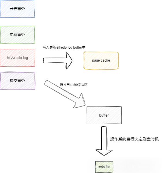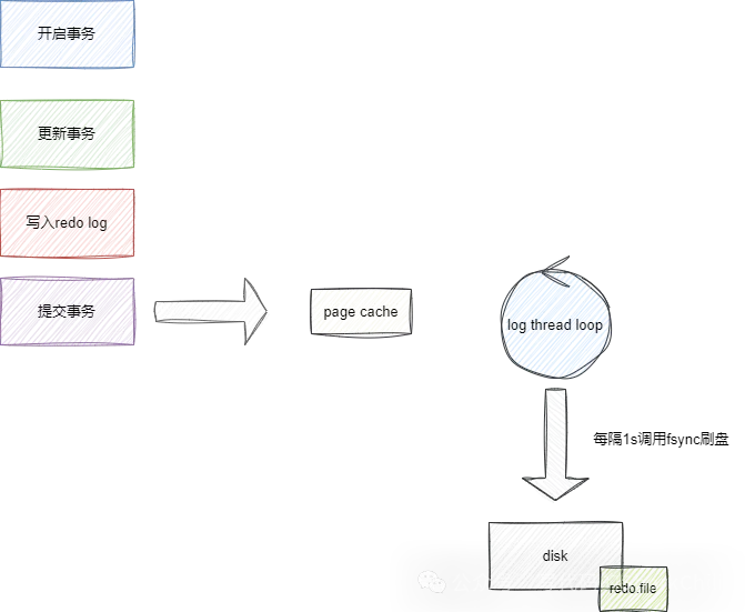 当这个值为0时,每次进行修改写入到redo log buffer,然后redo log buffer会将数据写到page cache中,由log thread每个1s调用操作系统函数fsync将数据写入到redo.file中。很可能因为服务器崩溃或者宕机导致丢失1s的数据。