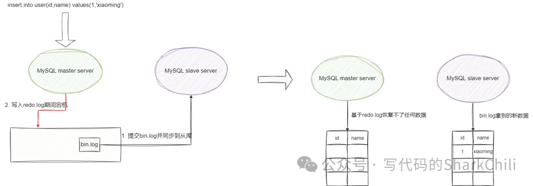 假如我们bin.log进行commit成功之后数据库宕机,二阶段提交是如何保证数据库一致性的呢?还是老规矩: 数据库重启恢复,然后主库发现bin.log有个commit成功的数据(事务是完整的)然redo.log处于prepare阶段,但是我们还是可以根据情况推断出有个当前主库有个commit成功的事务,所以redo.log会根据bin.log将redo.log设置为commit从库已根据主库的bin.log发现有新增一条新数据,由此同步一条更新数据,双方都有了一条新数据,数据库一致性由此保证: