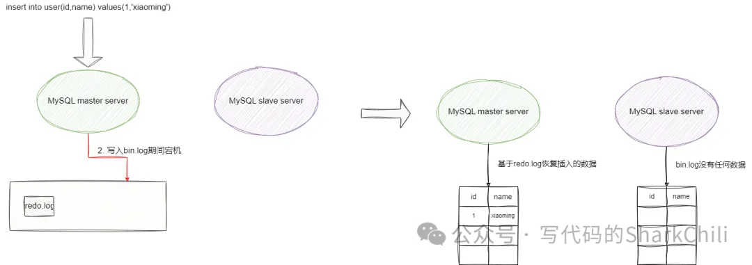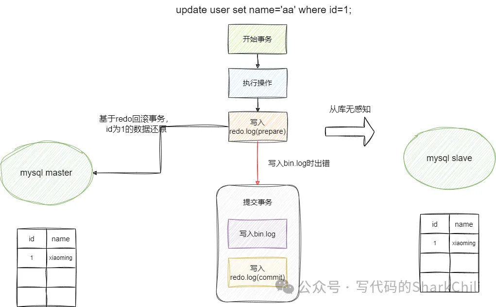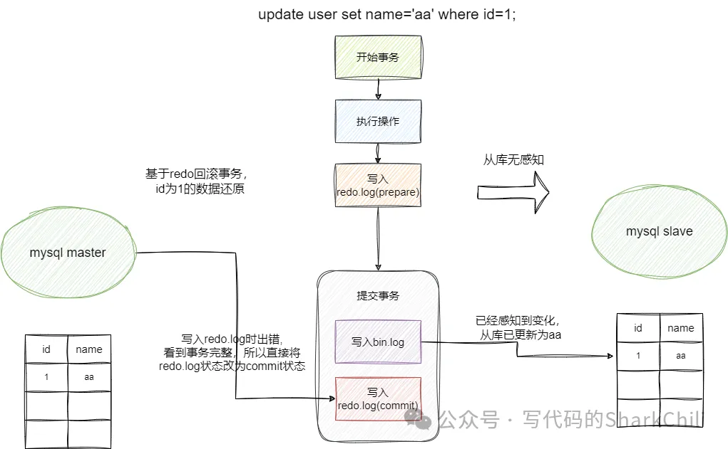 有了这样一个整体步骤我们不妨用两种情况来举个例子演示一下二阶段提交如何保证数据一致性。 假设我们有一张user表,这张表只有id、name两个字段。我们执行如下SQL: 复制update user set name=aa where id=1;1. 假如我们在redo.log提交时数据库宕机,二阶段是如何保证数据一致性的呢? 首先数据库重启恢复,然后主库发现redo.log日志处于prepare而且bin.log也没有写入,所以一切恢复到之前的样子(事务回滚),而从库对此无感,同步时也是同步成操作失败之前的样子,一切风平浪静: