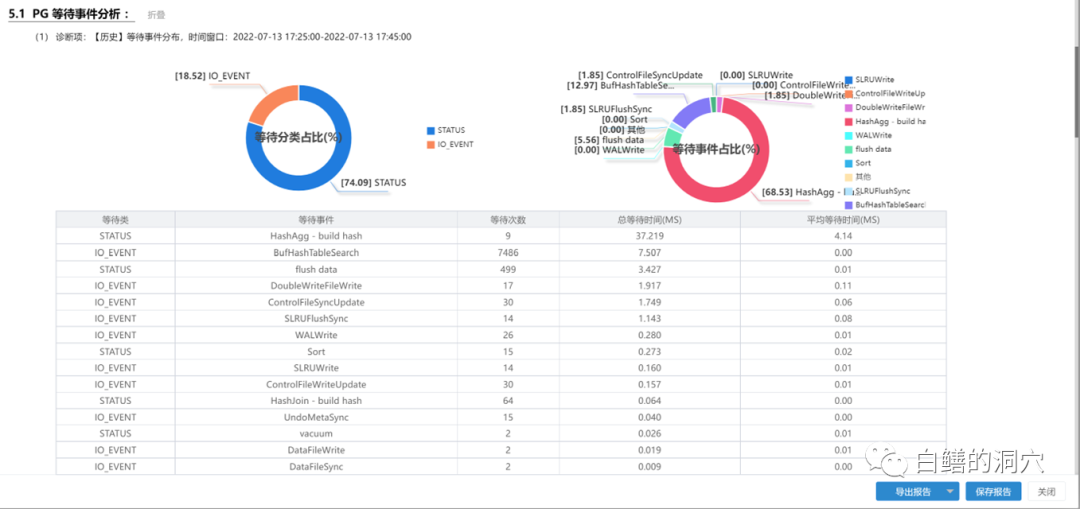 比如上面的案例,通过等待事件分析,发现系统中的HASH JION的并发执行过大。亿华云 本次梳理的等待事件涵盖了PostgreSQL(9.x-15),openGauss系列数据库,包含海量G100、南大通用GBASE 8C、MogDB等兼容国产数据库。以及华为商用版的Gaussdb、Gaussdb DWS,以及阿里Polardb-Postgresql、Polardb-O等相关兼容的数据库产品。 等待事件的知识图谱要覆盖数据库的各种历史版本,才能在各种用户的场景中发挥作用。我在梳理等待事件的时候,对于某些等待事件也知之不多,因此经常向各个厂家的朋友请教,在这里我也要对给与我帮助的各个友商的朋友表示感谢。 在梳理等待事件知识图谱的时候,我也经常会遇到某些等待事件,目前已经被厂商废弃了,因此很难给出明确的答案。我想对于数据库产品的研发人员来说,可以不太去关注已经废弃的免费信息发布网功能,但是对于数据库厂商来说,这些功能虽然在新版本的数据库中被废弃了,但是低版本的数据库可能还在用户侧运行着,这些用户也应该是数据库厂商的服务对象。这些被废弃的等待事件,其知识内容也还是应该继续有人维护的。 如果大家对PG类数据库的等待事件感兴趣,可以收藏。同时本文中的一些知识梳理过程中肯定存在一些不准确甚至错误的地方。也希望有共同爱好的朋友指出其中的错误,让这个知识库更加准确。我也将定期将修订后的版本发布给大家。当前的版本,在我们公司内部的版本号是5.3。 分类 名称 描述 关联根因 Activity ArchiverMain 归档进程的主循环等待 后台进程,一般可忽略 Activity AutoVacuumMain autovacuum启动进程的主循环等待 后台进程,一般可忽略 Activity BgWriterHibernate 后台写入进程等待,正在休眠 后台进程,一般可忽略 Activity BgWriterMain bgwriter进程的主循环等待 后台进程,一般可忽略 Activity CheckpointerMain CKPT进程主循环等待 后台进程,一般可忽略 Activity LogicalApplyMain 逻辑应用进程主循环等待 后台进程,一般可忽略 Activity LogicalLauncherMain 逻辑启动进程主循环等待 后台进程,一般可忽略 Activity PgStatMain 统计信息采集进程主循环等待 后台进程,一般可忽略 Activity RecoveryWalAll 实例恢复时等待WAL数据流到达 等待新的WAL数据 Activity RecoveryWalStream 在恢复时再次尝试检索 WAL 数据之前,等待任何类型的源(本地、存档或流)中的 WAL 数据不可用时 等待新的WAL数据 Activity SysLoggerMain syslogger进程主循环等待 后台进程,一般可忽略 Activity WalReceiverMain WAL接收进程主循环等待 后台进程,一般可忽略 Activity WalSenderMain WAL发送进程主循环等待 后台进程,一般可忽略 Activity WalWriterMain WAL写进程主循环等待 后台进程,一般可忽略 BufferPin BufferPin 等待获得BUFFER的PIN锁 热块、DBCACHE Client ClientRead 等待读取客户端输入 未提交事务,空闲等待 Client ClientWrite 等待向客户端发送数据 网络、TOPSQL Client LibPQWalReceiverConnect 在 WAL 接收器中等待建立与远程服务器的连接。 网络、远程服务器性能 Client LibPQWalReceiverReceive 等待 WAL 接收器接收来自远程服务器的数据。 网络、远程服务器性能 Client SSLOpenServer 等待SSL连接 网络问题、SSL配置问题 Client WalReceiverWaitStart 等待启动进程发送初始化复制数据流 网络问题、SSL配置问题 Client WalSenderWaitForWAL 进程正等待在 WAL 发件人进程中刷新预写日志 (WAL) 主库性能问题 Client WalSenderWriteData 进程正在等待 WAL 发件人进程中处理来自预写日志 (WAL) 接收方的回复时的任何活动 网络问题、主库性能问题 Extension Extension 等待和extension交换数据或消息 和扩展插件有关 IO BaseBackupRead 等待基础备份读取文件 磁盘IO IO BaseBackupSync 等待基础备份数据写入持久化存错 磁盘IO IO BaseBackupWrite 等待基础备份数据写入文件 磁盘IO IO BufFileRead bffered文件读等待 磁盘IO,热块,DBCACHE IO BufFileWrite buffered文件写等待 DBCACHE,磁盘IO IO BufHashTableSearch 缓冲区HASH 表查询 缓冲区hash表查询 IO ControlFileRead 等待控制文件读 磁盘IO IO ControlFileSync 等待控制文件写入持久化存储 磁盘IO IO ControlFileSyncUpdate 等待控制文件修改到达持久化存储 磁盘IO IO ControlFileWrite 等待写入控制文件 磁盘IO IO ControlFileWriteUpdate 等待一个修改控制文件的写操作 磁盘IO IO CopyFileRead COPY命令中的读等待 磁盘IO IO CopyFileWrite COPY命令中的写等待 磁盘IO IO DataFileExtend 等待 relation数据文件扩展 磁盘IO,磁盘容量 IO DataFileFlush 等待 relation数据文件写入持久存储 磁盘IO IO DataFileImmediateSync 等待一个立即同步 relation 数据文件写入持久存储 磁盘IO IO DataFilePrefetch 等待从Relation数据文件异步预读数据 磁盘IO IO DataFileRead 等待从relation数据文件读数据 磁盘IO IO DataFileSync 等待 relation 数据文件的变化写入持久存储 磁盘IO IO DataFileTruncate 等待relation 数据文件截断 磁盘IO IO DataFileWrite 等待 relation数据文件写 磁盘IO IO DisableConnectFileRead HA锁分片逻辑文件读取 磁盘IO,分布式事务 IO DisableConnectFileSync HA锁分片逻辑文件强制刷盘 磁盘IO,分布式事务 IO DisableConnectFileWrite HA锁分片逻辑文件写入 磁盘IO,分布式事务 IO DoubleWriteFileRead 双写文件读,和双写区IO有关的读 磁盘IO,DML操作 IO DoubleWriteFileWrite 双写文件写,与脏快写盘有关 并发DML、DML操作 IO DSMFillZeroWrite 等待向一个动态共享内存文件写入字节0 并行查询、系统并发、后台任务 IO DWSingleFlushGetPos 单页面双写文件查找可用位置 磁盘IO,并发DML IO DWSingleFlushWrite 刷新双写数据