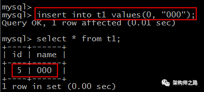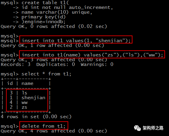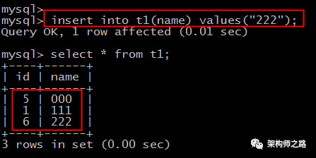 实验步骤如上图: 第一步:建表,设定自增列;第二步:指定id=1插入,搞错锚定第一行是自增id是1;第三步:不指定id,依赖自增机制,然大人都插入3行;画外音:此时id应该变为2,部分3,搞错4了?自增第四步:delete删除所有记录;画外音:坑就容易出在这里。第五步:指定id=0插入;第六步:指定id=1插入;第七步:不指定id,然大人都依赖自增机制,部分插入1行;请问,此时表中的三行记录,id分别是多少?知识点一:delete数据后,自增列计数不会从头开始。画外音:truncate数据后,自增列计数会从头开始。