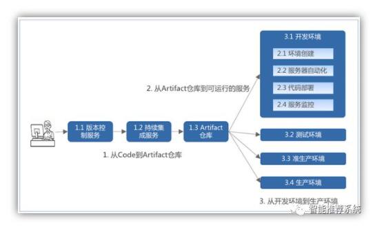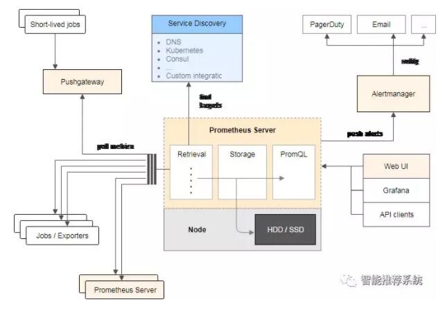 Prometheus 是由 SoundCloud 开发的开源监控报警系统和时序列数据库( TSDB )。Prometheus 使用 Go 语言开发,是 Google BorgMon 监控系统的开源版本。相对于其它监控系统使用的 push 数据的方式,prometheus 使用的是 pull 的方式,其架构如图7所示: 如上图所示,prometheus 包含的主要组件如下: Prometheus Server 主要负责数据采集和存储,提供 PromQL 查询语言的支持。Server 通过配置文件、文本文件、Zookeeper、Consul、DNS SRV Lookup等方式指定抓取目标。根据这些目标会,Server 定时去抓取 metric s数据,每个抓取目标需要暴露一个 http 服务的接口给它定时抓取。客户端SDK:官方提供的客户端类库有 go、java、scala、python、ruby,其他还有很多第三方开发的类库,支持 nodejs、php、erlang 等。Push Gateway 支持临时性 Job 主动推送指标的中间网关。Exporter Exporter 是Prometheus的一类数据采集组件的总称。它负责从目标处搜集数据,并将其转化为 Prometheus 支持的格式。与传统的数据采集组件不同的是,它并不向中央服务器发送数据,而是等待中央服务器主动前来抓取。Prometheus提供多种类型的 Exporter 用于采集各种不同服务的运行状态。目前支持的有数据库、硬件、消息中间件、存储系统、HTTP服务器、JMX等。alertmanager:是一个单独的服务,可以支持 Prometheus 的查询语句,提供十分灵活的报警方式。Prometheus HTTP API的查询方式,自定义所需要的输出。Grafana 是一套开源的分析监视平台,支持 Graphite, InfluxDB, OpenTSDB, Prometheus, Elasticsearch, CloudWatch 等数据源,其 UI 非常漂亮且高度定制化。创业公司选择 Prometheus + Grafana 的方案,再加上统一的服务框架(如 gRPC ),可以满足大部分中小团队的监控需求。 14、配置系统随着程序功能的日益复杂,程序的配置日益增多:各种功能的开关、降级开关,灰度开关,参数的配置、服务器的地址、数据库配置等等,除此之外,对后台程序配置的要求也越来越高:配置修改后实时生效,灰度发布,分环境、分用户,分集群管理配置,完善的权限、审核机制等等,在这样的大环境下,传统的通过配置文件、数据库等方式已经越来越无法满足开发人员对配置管理的需求,业界有如下两种方案: 基于 zk 和 etcd,支持界面和 api ,用数据库来保存版本历史,预案,走审核流程,最后下发到 zk 或 etcd 这种有推送能力的存储里(服务注册本身也是用 zk 或 etcd,选型就一块了)。客户端都直接和 zk 或 etcd 打交道。至于灰度发布,各家不同,有一种实现是同时发布一个需要灰度的 IP 列表,客户端监听到配置节点变化时,对比一下自己是否属于该列表。PHP 这种无状态的语言和其他 zk/etcd 不支持的语言,只好自己在客户端的机器上起一个 Agent 来监听变化,再写到配置文件或共享内存,如 360 的 Qconf。基于运维自动化的配置文件的推送,审核流程,配置数据管理和方案一类似,下发时生成配置文件,基于运维自动化工具如Puppet,Ansible 推送到每个客户端,而应用则定时重新读取这个外部的配置文件,灰度发布在下发配置时指定IP列表。创业公司前期不需要这种复杂,直接上 zk,弄一个界面管理 zk 的内容,记录一下所有人的操作日志,程序直连 zk,或者或者用Qconf 等基于 zk 优化后的方案。 15、发布系统/部署系统从软件生产的层面看,代码到最终服务的典型流程如图8所示: 【图8】 流程图