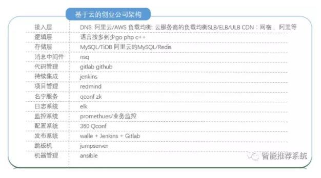 一般创业公司选择 Ansible 能解决大部问题,其简单,不需要安装额外的客户端,可以从命令行来运行,不需要使用配置文件。至于比较复杂的任务,Ansible 配置通过名为 Playbook 的配置文件中的 YAML 语法来加以处理。Playbook 还可以使用模板来扩展其功能。 二、创业公司的选择1、选择合适的语言选择团队熟悉的/能掌控的,创业公司人少事多,无太多冗余让研发团队熟悉新的语言,能快速上手,能快速出活,出了问题能快速解决的问题的语言才是好的选择。选择更现代一些的,这里的现代是指语言本身已经完成一些之前需要特殊处理的特性,比如内存管理,线程等等。选择开源轮子多的或者社区活跃度高的,这个原则是为了保证在开发过程中减少投入,有稳定可靠的轮子可以使用,遇到问题可以在网上快速搜索到答案。选择好招人的 一门合适的语言会让创业团队减少招聘的成本,快速招到合适的人。选择能让人有兴趣的 与上面一点相关,让人感兴趣,在后面留人时有用。2、选择合适的组件和云服务商选择靠谱的云服务商;选择云服务商的组件;选择成熟的开源组件,而不是最新出的组件;选择采用在一线互联网公司落地并且开源的,且在社区内形成良好口碑的产品;开源社区活跃度;选择靠谱的云服务商,其实这是一个伪命题,因为哪个服务商都不靠谱,他们所承诺的那些可用性问题基本上都会在你的身上发生,这里我们还是需要自己做一些工作,比如多服务商备份,如用CDN,你一定不要只选一家,至少选两家,一个是灾备,保持后台切换的能力,另一个是多点覆盖,不同的服务商在CDN节点上的资源是不一样的。 选择了云服务商以后,就会有很多的产品你可以选择了,比较存储,队列这些都会有现成的产品,这个时候就纠结了,是用呢?还是自己在云主机上搭呢?在这里我的建议是前期先用云服务商的,大了后再自己搞,这样会少掉很多运维的事情,但是这里要多了解一下云服务商的组件特性以及一些坑,比如他们内网会经常断开,他们升级也会闪断,所以在业务侧要做好容错和规避。 关于开源组件,尽可能选择成熟的,成熟的组件经历了时间的考验,基本不会出大的问题,并且有成套的配套工具,出了问题在网上也可以很快的找到答案,你所遇到的坑基本上都有人踩过了。 3、制定流程和规范制定开发的规范,代码及代码分支管理规范,关键性代码仅少数人有权限;制定发布流程规范,从发布系统落地;制定运维规范;制定数据库操作规范,收拢数据库操作权限;制定告警处理流程,做到告警有人看有人处理;制定汇报机制,晨会/周报;4、自研和选型合适的辅助系统所有的流程和规范都需要用系统来固化,否则就是空中楼阁,如何选择这些系统呢?参照上个章节咱们那些开源的,对比一下选择的语言,组件之类的,选择一个最合适的即可。 比如项目管理的,看下自己是什么类型的公司,开发的节奏是怎样的,瀑布,敏捷的 按项目划分,还是按客户划分等等,平时是按项目组织还是按任务组织等等 比如日志系统,之前是打的文本,那么上一个elk,规范化一些日志组件,基本上很长一段时间内不用考虑日志系统的问题,最多拆分一下或者扩容一下。等到组织大了,自己搞一个日志系统。 比如代码管理,项目管理系统这些都放内网,安全,在互联网公司来说,属于命脉了,命脉的东西还是放在别人拿不到或很难拿到的地方会比较靠谱一些。 5、选择过程中需要思考的问题技术栈的选择有点像做出了某种承诺,在一定的时间内这种承诺没法改变,于是我们需要在选择的时候有一些思考。 看前面内容,有一个词出现了三次,合适,选择是合适的,不是最好,也不是最新,是最合适,适合是针对当下,这种选择是最合适的吗?比如用 Go 这条线的东西,技术比较新,业界组件储备够吗?组织内的人员储备够吗?学习成本多少?写出来的东西能满足业务性能要求吗?能满足时间要求吗? 向未来看一眼,在一年到三年内,我们需要做出改变吗?技术栈要做根本性的改变吗?如果组织发展很快,在 200 人,500 人时,现有的技术栈是否需要大动? 创业过程中需要考虑成本,这里的成本不仅仅是花费多少钱,付出多少工资,有时更重要的是时间成本,很多业务在创业时大家拼的就是时间,就是一个时间窗,过了就没你什么事儿了。 三、基于云的创业公司后台技术架构结合上面内容的考量,在对一个个系统和组件的分析选型之后,以云服务为基础,一个创业公司的后台技术架构建议如图10所示: 【图10】 后台技术架构
