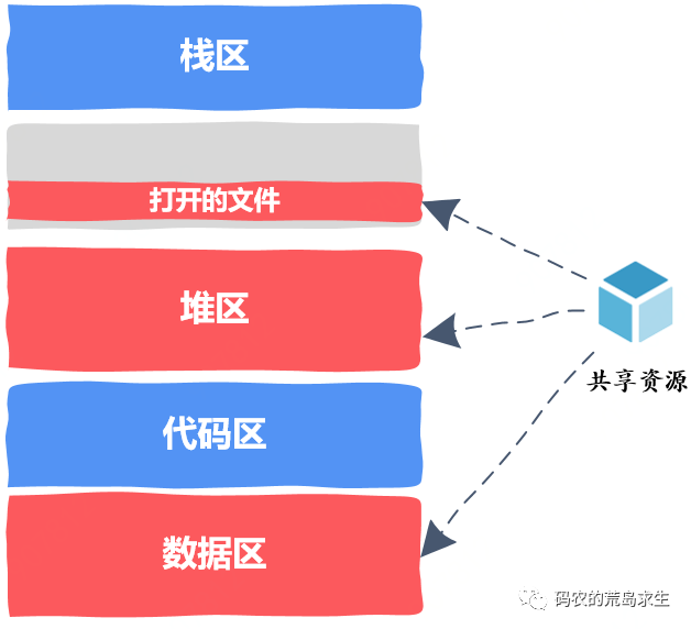 线程私有的栈区就是线程自己家。 线程间共享数据除了上一节提到的剩下的区域就是公共场合了,这包括: 用于动态分配内存的堆区,我们用C/C++中的malloc或者new就是在堆区上申请的内存全局区,这里存放的就是全局变量文件,我们知道线程是共享进程打开的文件 图片