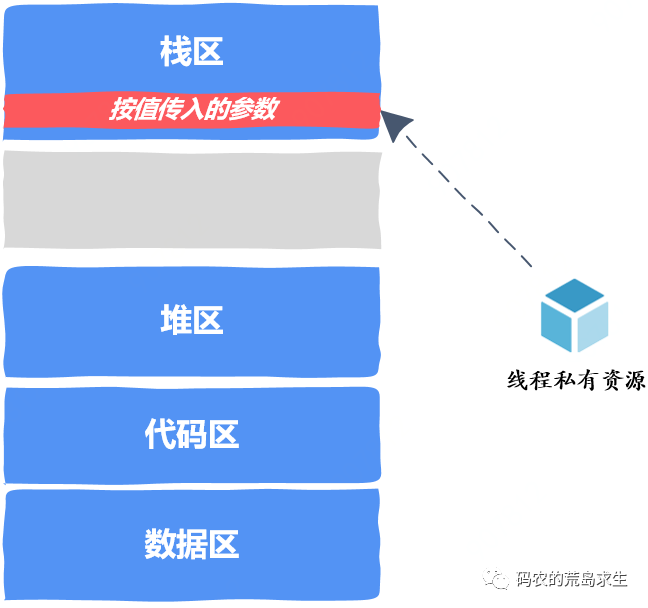 这样的代码请放心大胆的在多线程中使用,不会有任何问题。 有的同学可能会说,那如果我们还是使用线程私有资源,但是传入函数参数呢? 线程私有资源+函数参数这样的代码是线程安全的吗?自己先想一想这个问题。 答案是it depends,也就是要看情况。看什么情况呢? 1,按值传参如果你传入的参数的方式是按值传入,那么没有问题,代码依然是线程安全的: 复制int func(int num) {                        num++;                        return num;                        }1.2.3.4.                                            这这段代码无论在多少个线程中调用怎么调用什么时候调用都会正确返回参数加1后的值。 原因很简单,按值传入的这些参数是线程私有资源。  图片 2,按引用传参但如果是按引用传入参数,那么情况就不一样了: 复制int func(int* num) {                        ++(*num);                        return *num;                        }1.2.3.4.                                            如果调用该函数的线程传入的参数是线程私有资源,那么该函数依然是线程安全的,能正确的返回参数加1后的值。 但如果传入的参数是全局变量,就像这样: 复制int global_num = 1;                        int func(int* num) {                        ++(*num);                        return *num;                        }                        // 线程1                        void thread1() {                        func(&global_num);                        }                        // 线程2                        void thread1() {                        func(&global_num);                        }1.2.3.4.5.6.7.8.9.10.11.12.13.14.15.16.17.18.19.                                            那此时func函数将不再是线程安全代码,因为传入的参数指向了全局变量,这个全局变量是所有线程可共享资源,这种情况下如果不改变全局变量的使用方式,那么对该全局变量的加1操作必须施加某种秩序,比如加锁。  图片