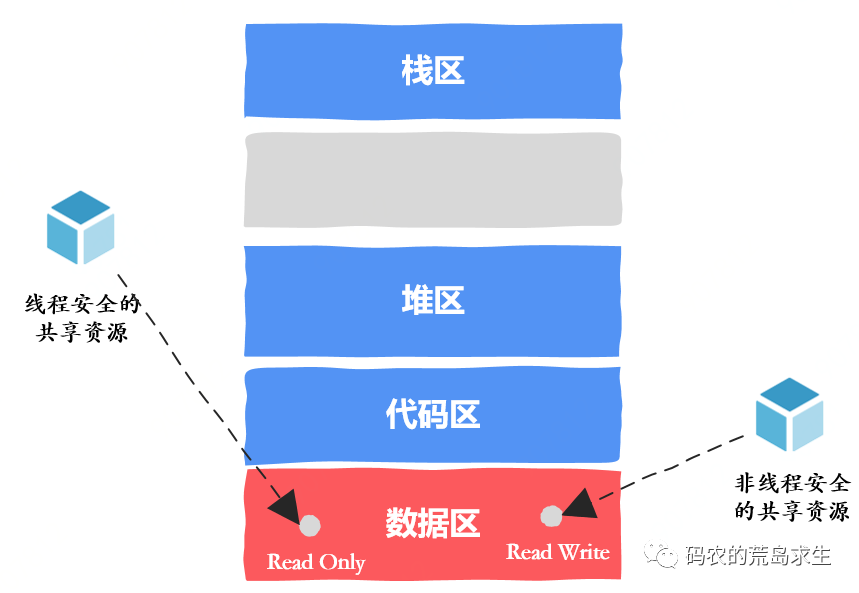 有的同学可能说,等等,在上一篇文章不是说还有代码区和动态链接库吗? 要知道这两个区域是不能被修改的,也就是说这两个区域是只读的,因此多个线程使用是没有问题的。 在刚才我们提到的堆区、数据区以及文件,这些就是所有的线程都可以共享的资源,也就是公共场所,线程在这些公共场所就不能随便浪了。 线程使用这些共享资源必须要遵守秩序,这个秩序的核心就是对共享资源的使用不能妨碍到其它线程,无论你使用各种锁也好、信号量也罢,其目的都是在维护公共场所的秩序。 知道了哪些是线程私有的,哪些是线程间共享的,接下来就简单了。 值得注意的是,关于线程安全的一切问题全部围绕着线程私有数据与线程共享数据来处理,抓住了线程私有资源和共享资源这个主要矛盾也就抓住了解决线程安全问题的核心。 接下来我们看下在各种情况下该怎样实现线程安全,依然以C/C++代码为例,但是这里讲解的方法适用于任何语言,请放心,这些代码足够简单。 只使用线程私有资源我们来看这段代码: 复制int func() {                        int a = 1;                        int b = 1;                        return a + b;                        }1.2.3.4.5.                                            这段代码在前面提到过,无论你在多少个线程中怎么调用什么时候调用,func函数都会确定的返回2,该函数不依赖任何全局变量,不依赖任何函数参数,且使用的局部变量都是线程私有资源,这样的代码也被称为无状态函数,stateless,很显然这样的代码是线程安全的。  图片